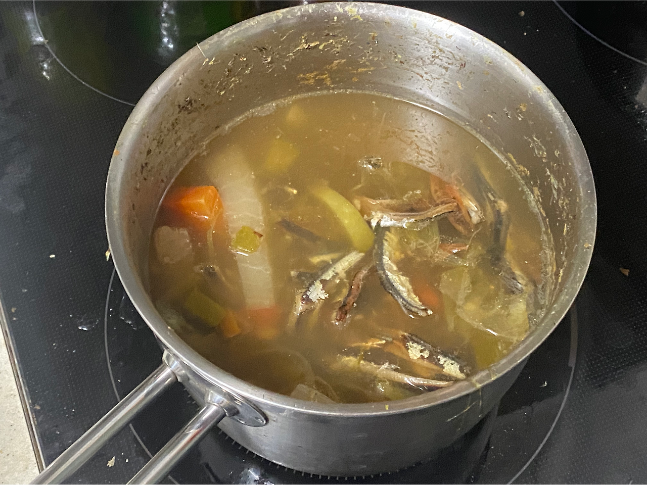 그리고 멸치 내장을 따로 떼어서 넣으면, 채수 쪽은 마무리.