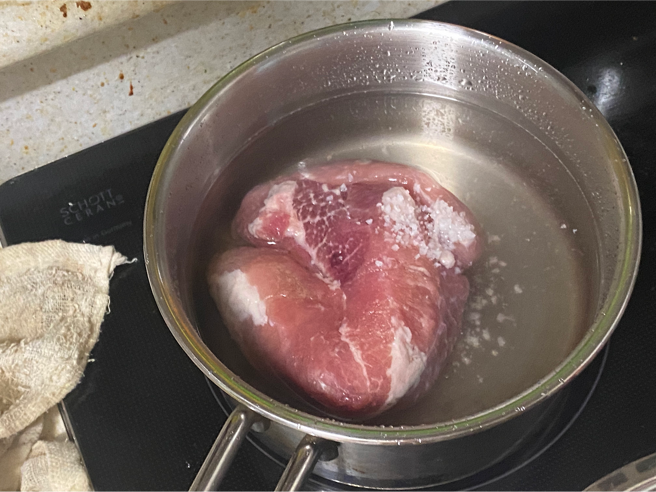 우선 멸치를 추가해서 밸러스를 조정하고, 돼지를 냄비 속에서 계속 뒤집으면서 고루고루 익게 했다. 그러고 나서 물을 추가한 뒤에 또 충~분히 물이 줄었을 때, 마침내 두 육수를 합쳤다.