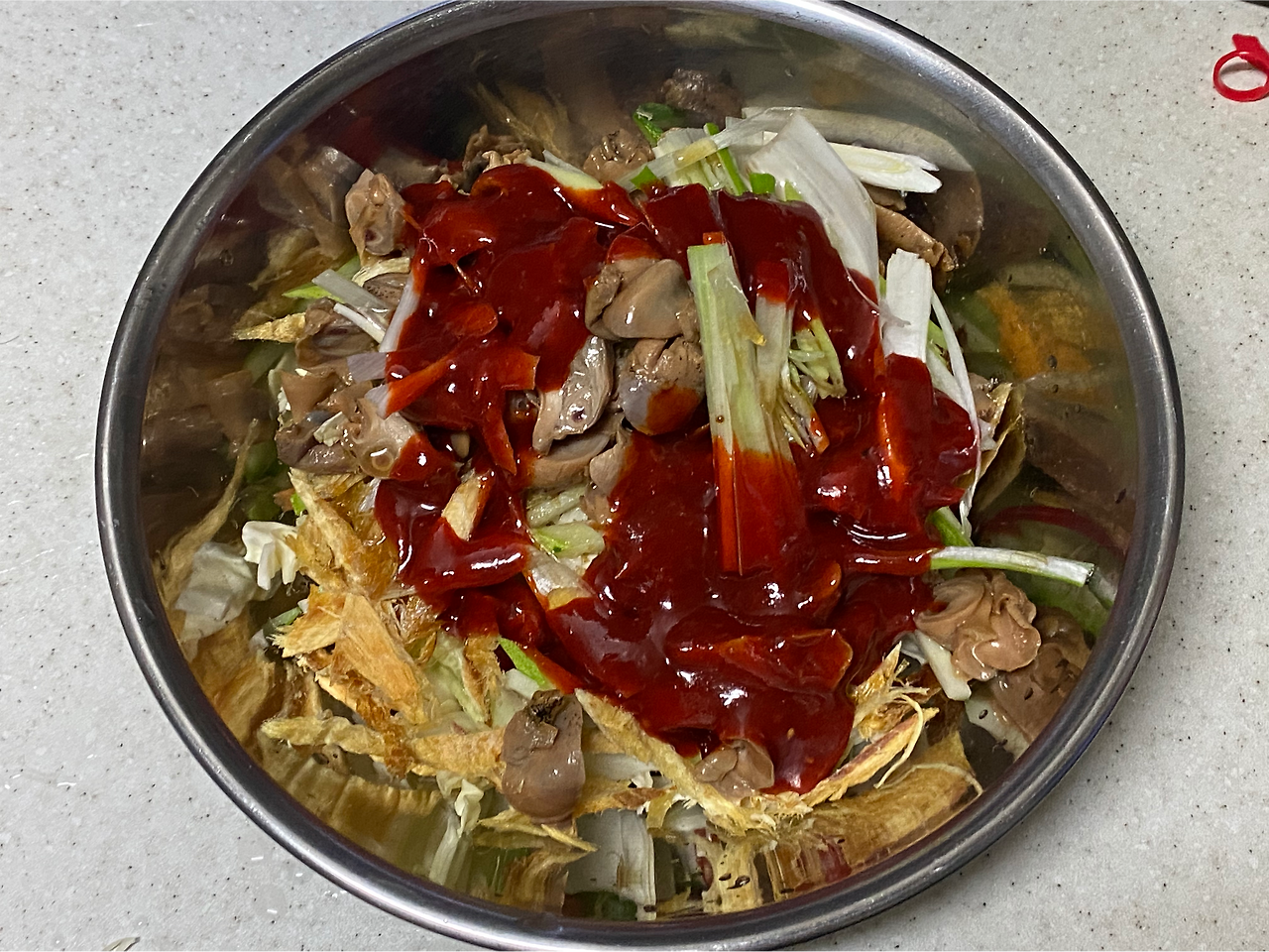 그래서 대강 양념까지. 음...그런데 초고추장을 뿌리고 주둥이를 닦아낸 것을 입으로 빨며, 맛을 보니. 아 너무 단맛이 적다. 비빔양념은 아니고 초고추장이라서 그런 걸까. 설탕을 넉넉히 넣어야 할까 하고 생각을 해봤는데...더 좋은 게 있다. 이건 엄마에게 배운 적이 없는 재료.