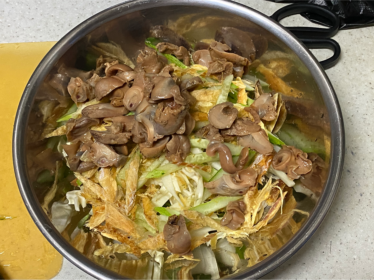 황태와 골뱅이는 이렇게. 야채는 뭐. 당근 채썰고, 오이 채썰고, 양배추는 대충 썰고, 양파는 까기 귀찮아서 빠졌다. 생각해보니 넣을 걸 그랬군. 대파 길쭉하게 썰어서 끝. 생각해보면 뚝딱인 요리다. 어릴 때 치킨집 주방에서 엄마는 면 삶는 짧은 시간만에 뚝딱 채소들을 손질했다.