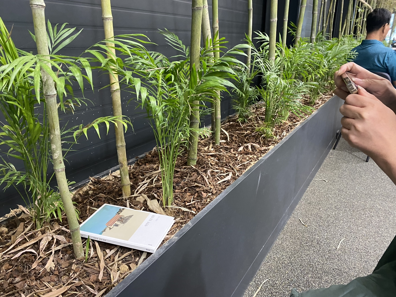 인천에서 조촐한 모임을 마치고 집으로 돌아오는 길. 거봉을 사기 위해 하나로마트에 들른 뒤, 올해 첫 제대로 된 가을 하늘 날씨를 이대로 보내긴 어렵다며 한군데 카페만 더 가자고 바깥양반이 말했다. 근처 카페로 가서 각자 책을 펴고 시간을 보냈다. 바깥양반은 책을 마치고 테이블 옆, 대나무가 자라고 있는 실내 화단에 놓더니 사진을 찍는다.
