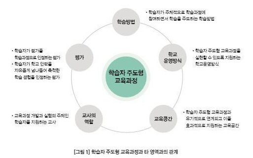 한국에서는 혁신교육을 주도하는 경기도교육청이 교육과정의 자율성을 실제 학교현장에서 실현하기 위한 다양한 노력을 하고 있습니다. 아래의 표를 보면 학교교육에서 교육과정의 주도성이란 어떤 것인지에 대해 대강 이해하실 수 있을 것 같습니다. 아래를 보시면 "평가"가 당연히 들어가 있고, "학습방법" 주도성이 명시되어 있죠. 즉, "교육과정 주도성"은 "학습 주도성"을 포함하는 상위개념입니다.