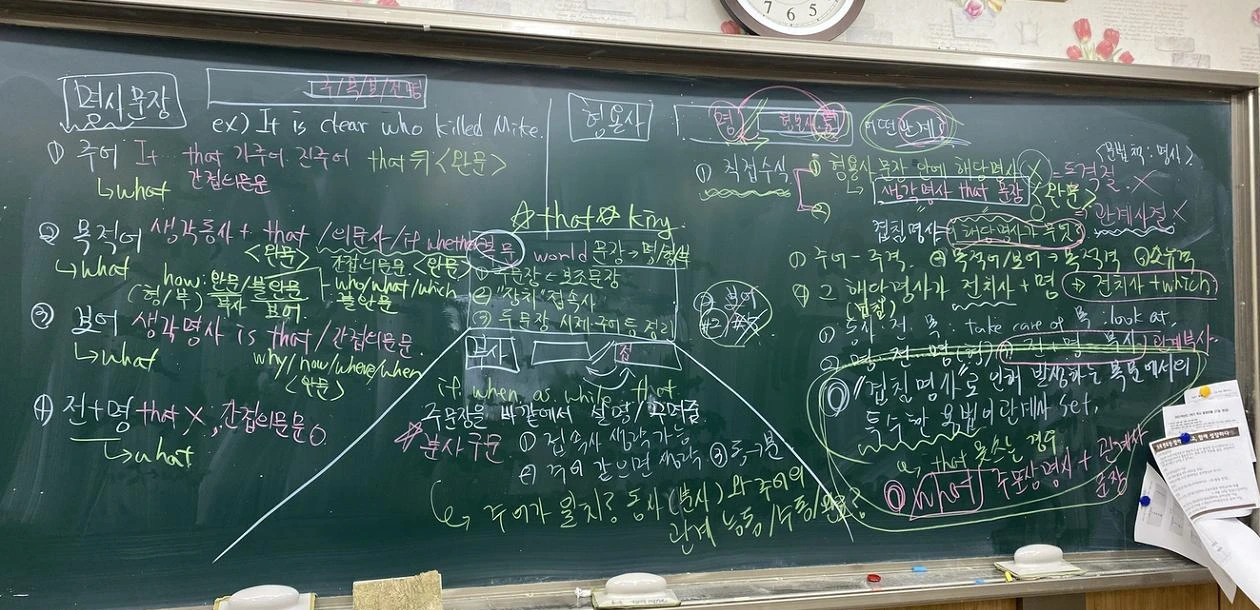 이상한 상황. 그러니까, 복문이라는 문법체계는 한 시간 내에(고등학교 수업은 일반적으로 하루에 한시간씩 과목들이 편성되어 있기에) 설명을 어쨌든 마쳐야 하는데, 그럼 복문이라는 문법체계를 전부 정리하는데에 위의 사진처럼 칠판 한바닥을 다 써야 합니다. 저것이 다 쓴 것도 아니지요 물론. 예문도 부족하고 연관된 문법을 설명해야 하는데 그러기에도 조금 부족합니다.