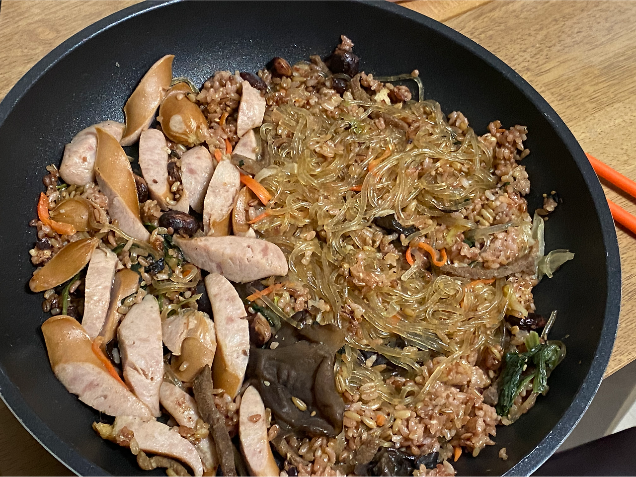 잡채밥을 만들려다가 냉장고 한켠에 소세지가 있는 것을 보고 경악했다. 유통기한이 퍽 지난 제품. 언제 또 왜 샀더라? 뭔가 바깥양반 구미에 맞는 음식을 만들어줄 때 산 모양인데, 기억이 나지 않는다. 옛글을 찾아보면 나올법도 하다만, 그럴 겨를은 없고. 일단 꺼내서 상태를 확인한다. 그리고 탕탕 두줄을 썰어서, 팬에 뒤늦게 올린다.