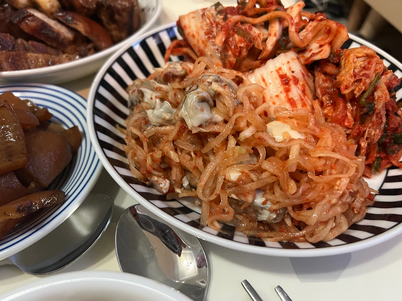 나는 거실 식탁에서 먹자고 했지만 바깥양반은 셋이 쓰기엔 좁다며 거실로 옮기자 한다. 별 수 없지 뭐. 접시들을 휘리릭 거실의 작은 접이식 상에 올린다. 그래놓고 밥상을 탁보니, 졸인 마늘에 돼지껍데기 하며, 이 아니 예뻐. 그리고 싱싱함 그자체인 굴 생채에 새김치까지. 얼마나 좋아.
