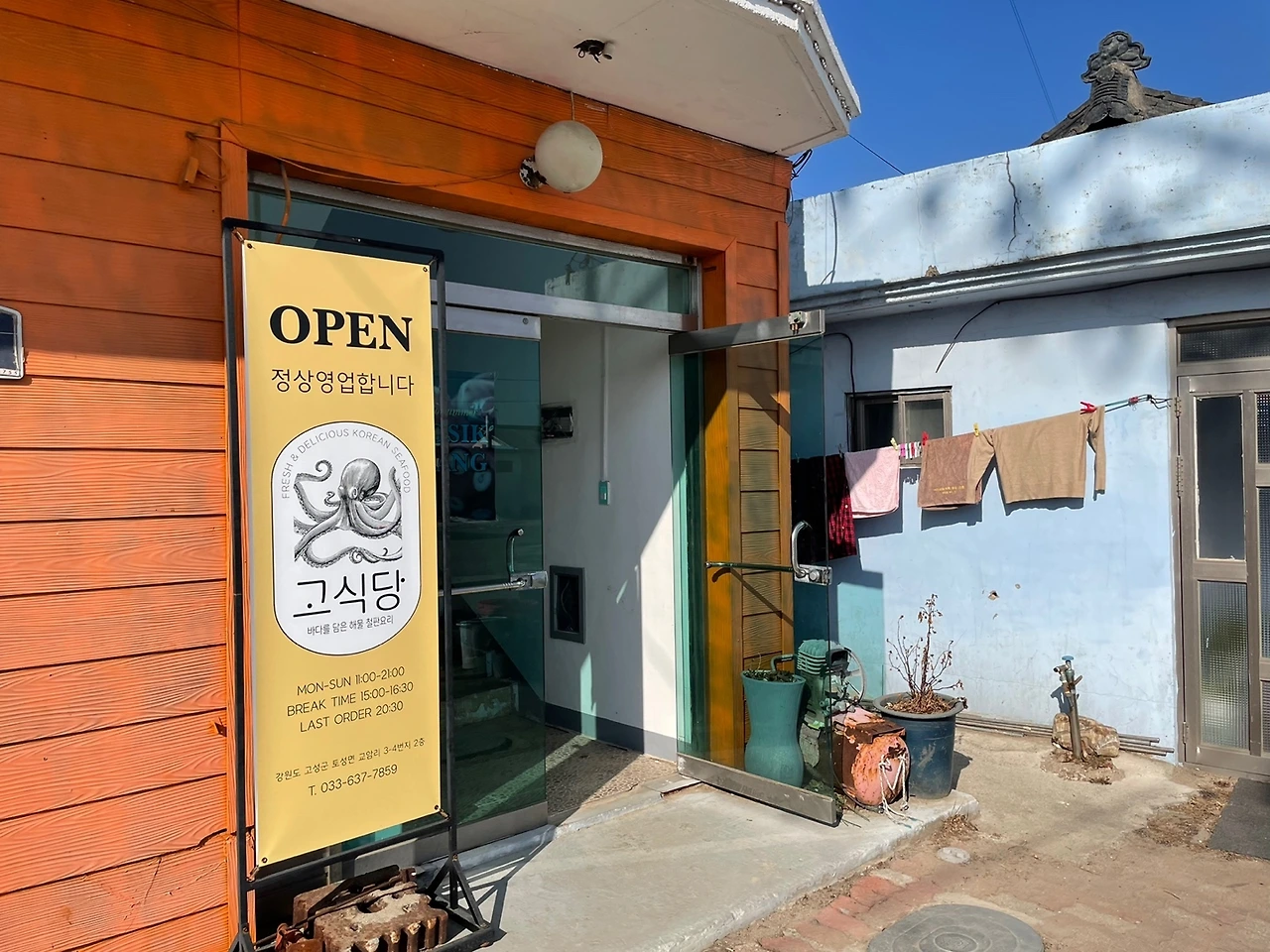 고식당은 좀 괜찮다. 느즈막히 점심을 먹으러 와서 여긴 좀 맘에 들었다. 우선 위치가 좋다. 백촌막국수 바로 아랫자락이라 백촌에 오는 정도의 감각으로 들를 수 있다. 속초의 청초호를 기준으로 차로 30분이 걸리지 않으니. 아니면 백촌과 고식당 두곳을 묶어서 하루 일정을 짜도 된다. 아점으로 백촌을 먹고 5시쯤, 브레이크타임이 끝나는 시간까지 걷다가, 쉬다가, 마시다가 고식당을 방문하는 일정이면 와 하루 알차다.