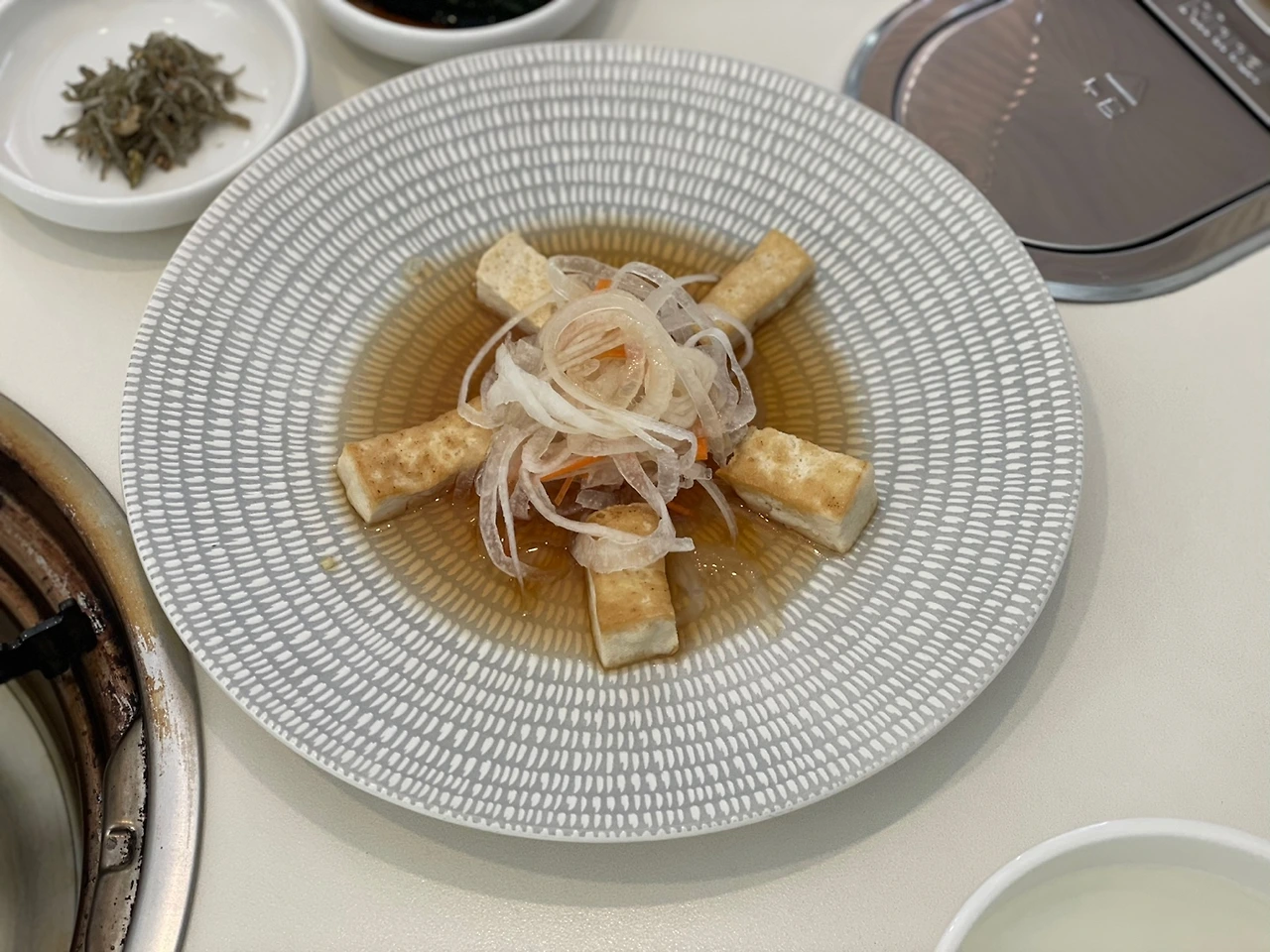 바깥양반은 식사 뒤에 두무부침에 간장양파절임을 올린 반찬에도 높은 평가를 줬다. 나도 그렇다. 굳이 메인메뉴들과 겹치지 않는 두부를 저렇게 따로 대접하는 차림새에서 고식당의 세심함이 느껴진다.