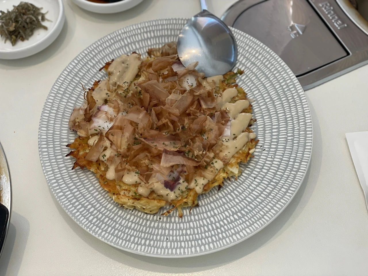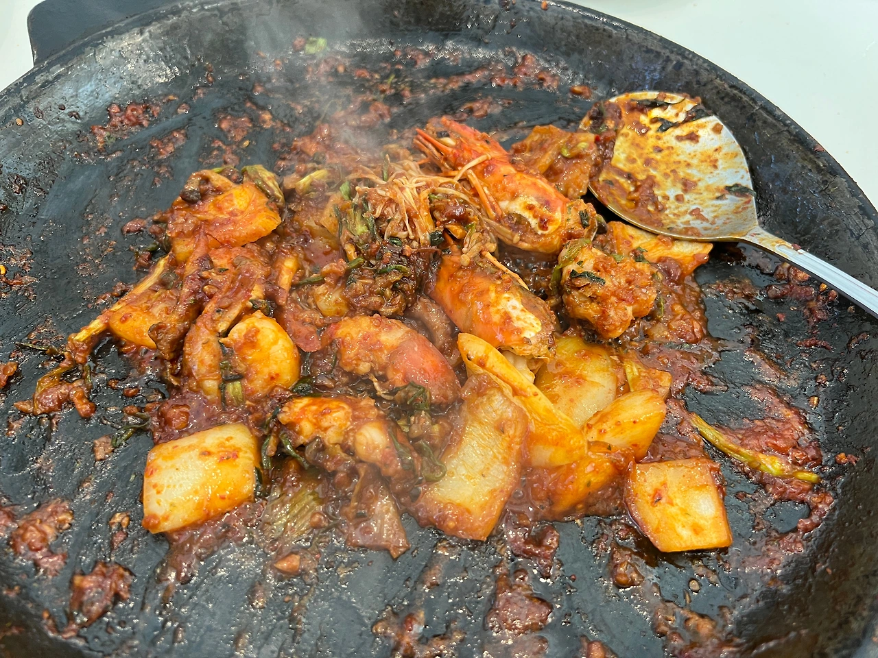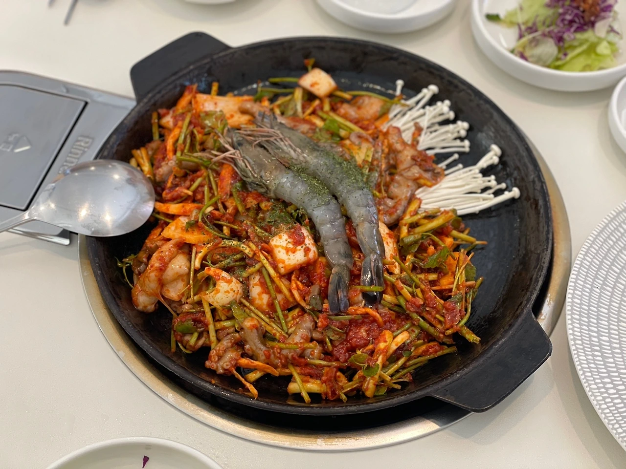 일단은 깔끔한 인테리어처럼 접시 소품 등이 모던하고,그런 가운데 철판냄비는 정작 연식이 제법 되어 보인다. 퍽 오래 다른 식당에서 길들여진 철판들을 들여온 모양. 그리고 미나리가 듬뿍 들어간 것이 반갑다. 벌써 미나리 먹을 철이구나. 위에 올라간 새우는 흰다리새우는 아니고 이름을 잘 모르겠다. 타이거새우던가? 어쨌든, 사장님의 안내대로 끓기 시작하자 불을 줄이고, 새우를 손질해 볶고 있으려니 이내 문어부침개가 나온다 오코노미야키에 문어숙회를 슬라이스해 올려, 평범했다. 대신 가격이 훌륭했는데 저 정도 퀄리티의 사이드디쉬가 1만원.