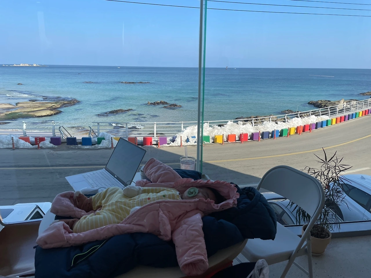 10년 전에 처음 바깥양반과 속초를 찾았을 때 속초 전역에 오션뷰 카페라곤 바다정원보다 훨씬 오래전에 생긴 나폴리아 뿐이었다. 그때의 나폴리아는 오션뷰라는 것 말고는 허름한데다 앞에 철조망도 있어서 그리 핫플레이스가 되기도 어려운 공간이었고, 어쩔 수 없이 택하는 선택지에 가까웠는데 나폴리아를 시작으로 여러개의 카페가 이렇게 거리를 이루다니 상전벽해. 뭐어 덕분에 화창한 날씨에 하염없이 바다를 바라보기엔 좋다. 아침에 나는 닭강정, 이틀 전에 먹고 남은 것을 먹어치웠고 바깥양반은 제빵소에서 빵을 시켜먹었다. 이런 곳에선 동백이를 데리고 사진을 찍지 않을 수 없지. 엄마 아빠가 아이를 괴롭혀가며 사진을 찍었다. 그러나 아직 머리가 무거운 아기는 앉혀놓으면 자연스럽게 고개가 내려와, 그 빵빵한 볼살을 축 늘어트린다. 엄마 아빠 욕심에 아이가 고되다.
