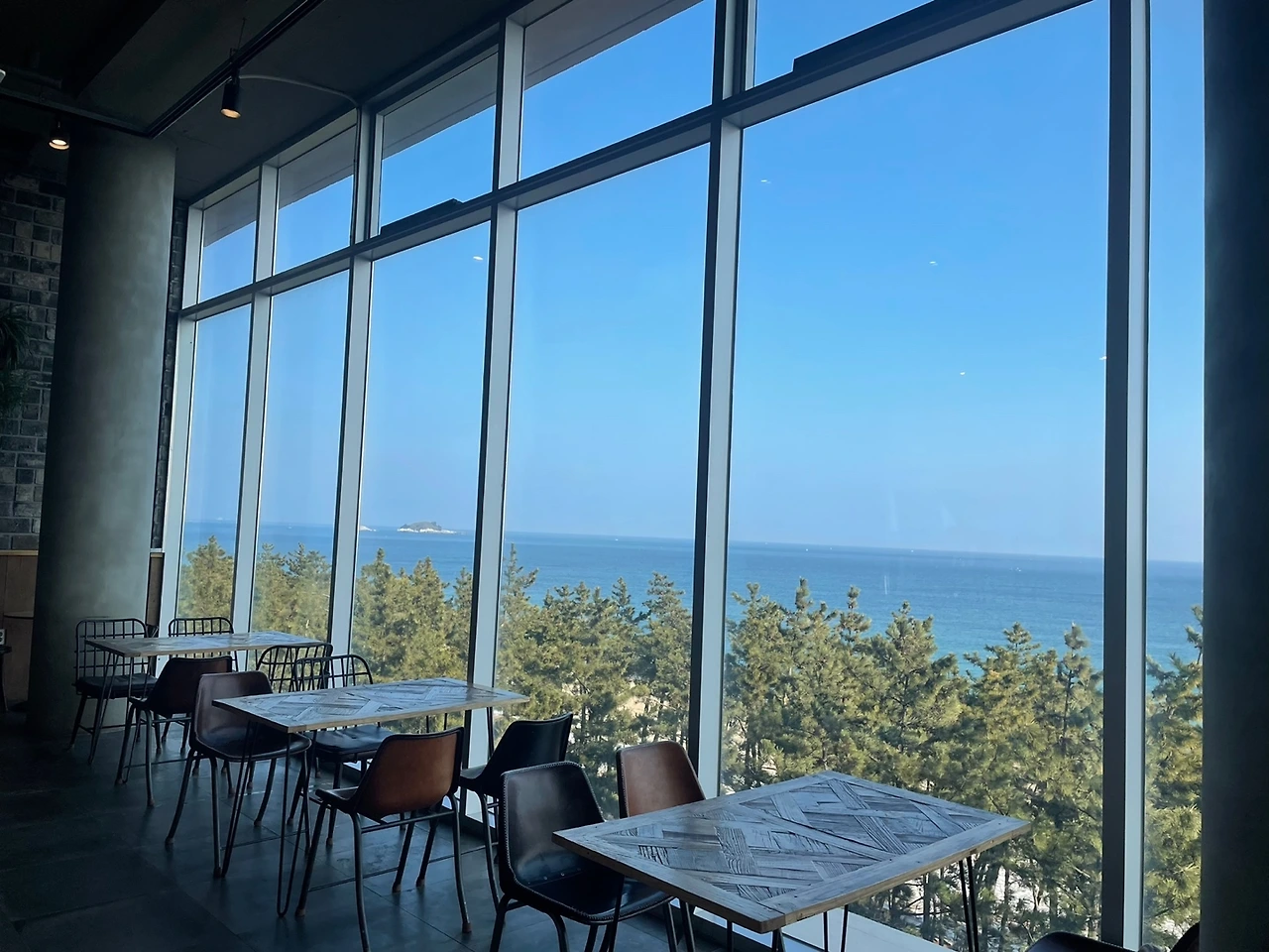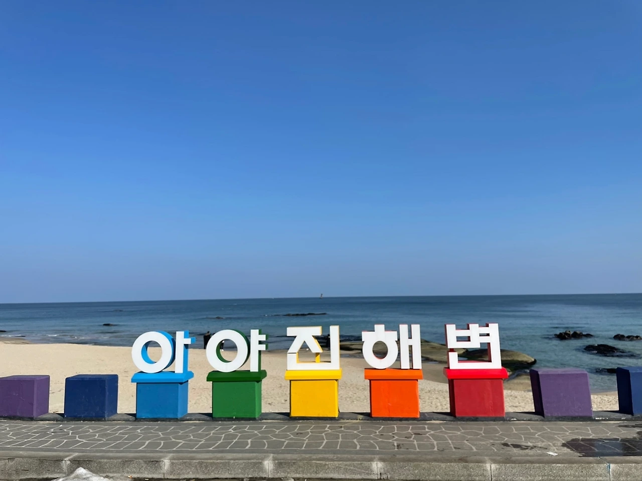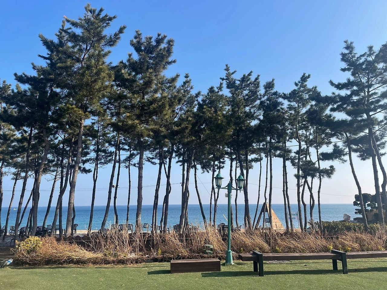 이어진 행선지는 아야진 해변. 이곳도 바로 한두해 전과 크게 달라졌다. 일곱빛깔로 도로 경계석을 칠해 바다풍경과 잘 어우러진다. 잠에 빠져든 동백이를 눕히고 좁은 테이블에서 분주히 일을 했다. 이 바로 옆 펜션에서 코로나가 퍼지기 전 막바지 휴가를 왔었다. 방에서 스파를 즐기며 오션뷰를 바라볼 수 있는 곳인데, 당시 가격으로도 퍽 비쌌었다구. 지금 다시 찾아보니 겨울, 평일이라 생각보다는 저렴한 편이다. 그런데 그냥 저렴도 아니고 꽤나 싸네?