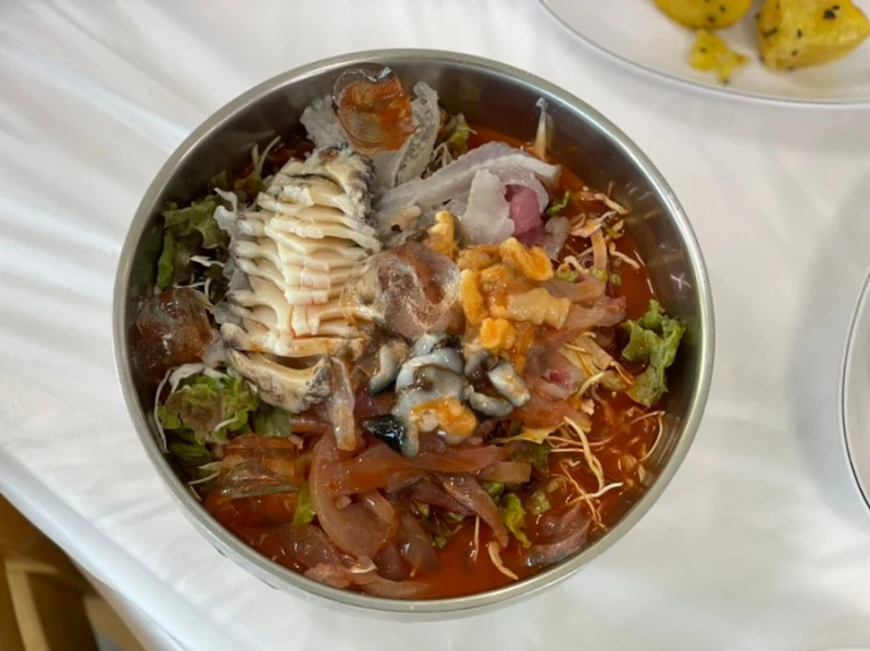 본론인 물회와 성게알비빔밥을 말하자면 둘 다 맛있게 먹었다. 양념장이야 시고 맵고 달고 시원하지. 회가 중하다. 1인분씩 시킬 수 있다는 점도 메리트인데, 사실 회전율이 높은 청초수가 해전물회를 2인분 단위로 끊어파는 것이 고약한 상술이지, 1인분으로 이정도 양에, 이 구성이면 더 할 나위 없다. 비빔밥에 성게알은 넉넉한데, 다만 이 철이 좀 쓴맛이 돌 때라고. 그래도 성게알은 성게알인지라 바깥양반은 반드시 시켜서 싹싹 비운다.