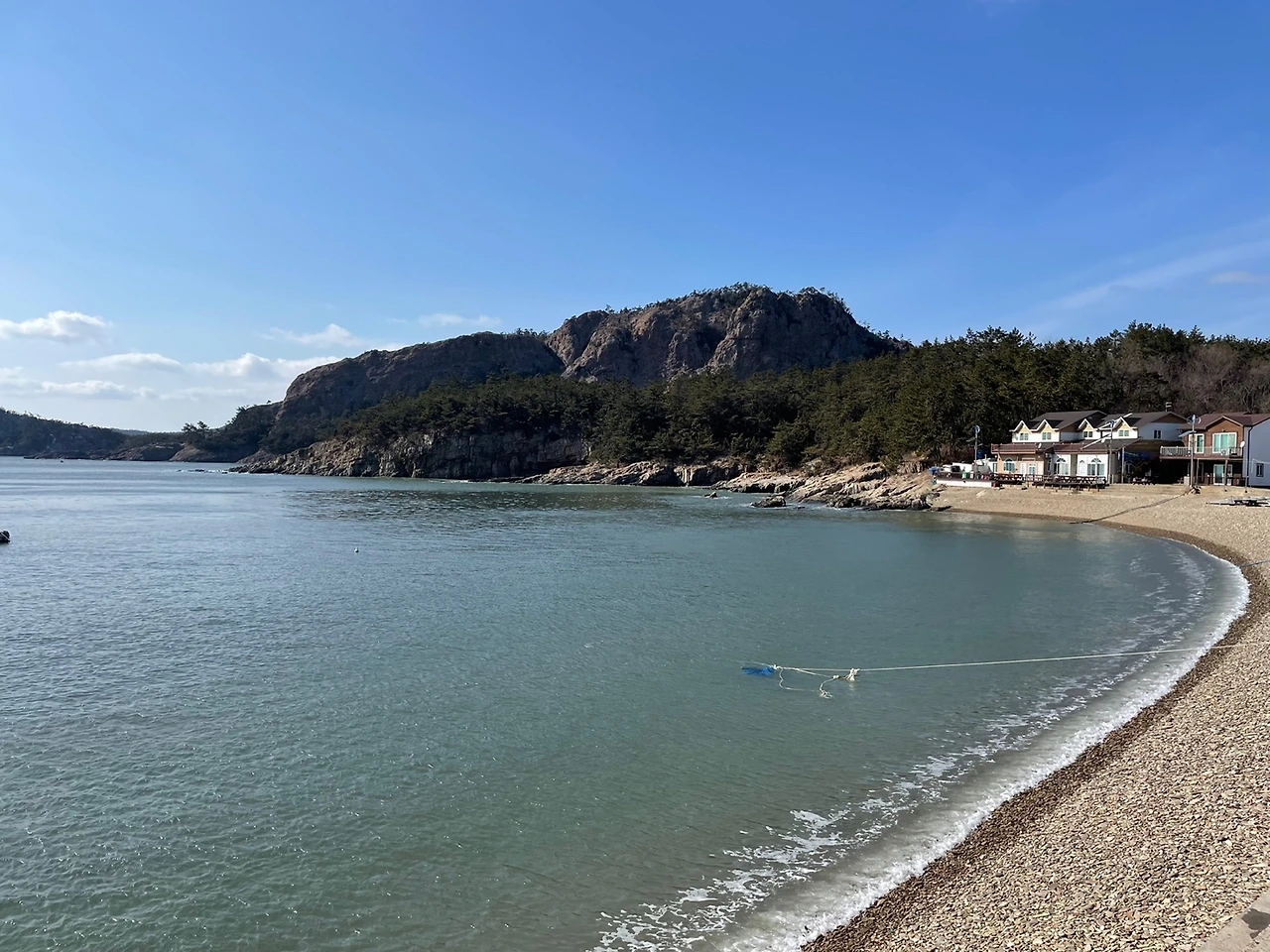 천천히 중간 중간 섬들의 풍광을 구경하며 지금이 봄이 아닌 것을 아쉬워 하는데 바깥양반이 잠깐 차를 세워달란다. 그런데 옥돌해변, 이, 해변이라고 하기엔 초등학교 운동장 정도 사이즈다. 펜션이 옹기종기 모여있고 해안가에 데크가 연결되어 있어서 산책로로 쓰기 좋은 가족 휴양지다.