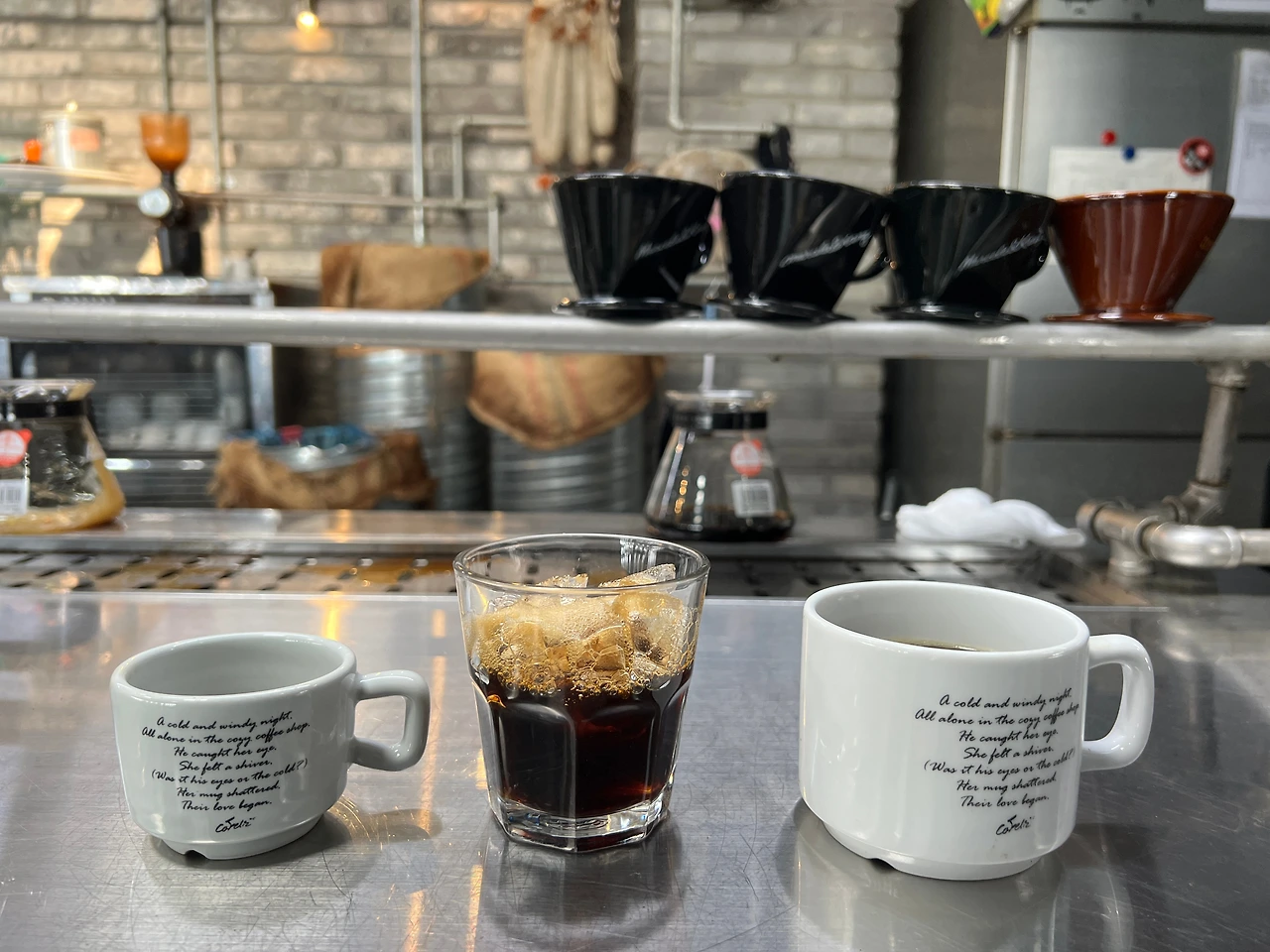 잠시 뒤 바에는 세개의 잔이 나란히 깔린다. 에스프레소 분량의 드립원액, 더운 물을 희석한 보편적 형식의 드립커피, 그리고 얼음에 부어진 원액. 나는 순서대로, 먼저 원액, 핫, 아이스를 차례로 맛봤다. 그 맛은 산미, 아로마, 그 밖의 여러가지 맛이 통제된 깔끔하고 순수한, 커피의 풍성한 맛 그 자체.