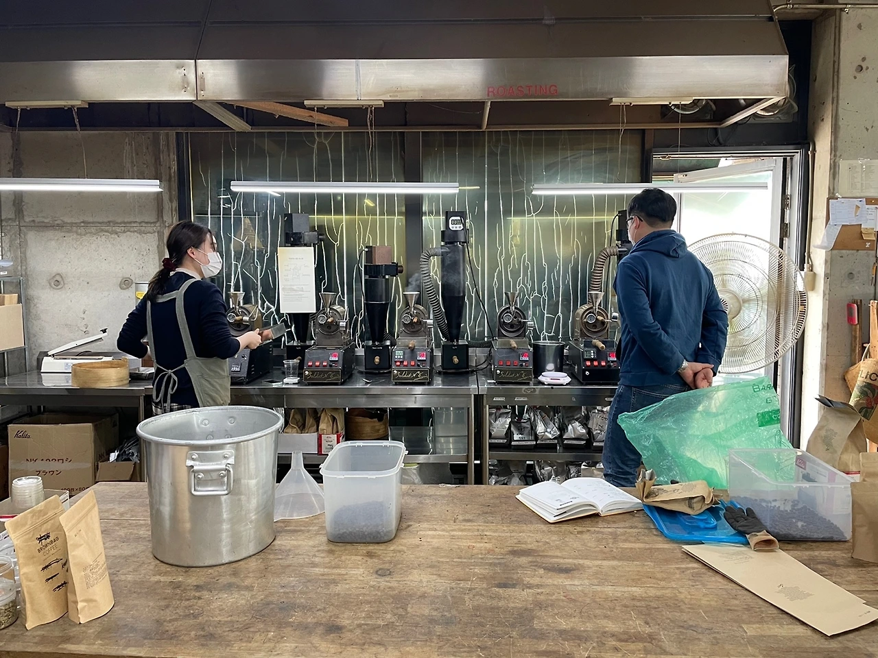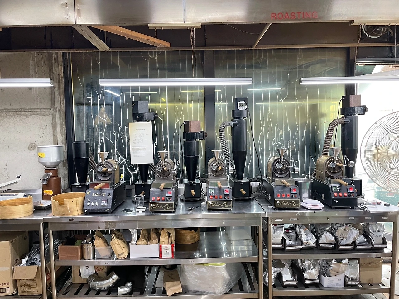 그런데 이게 웬걸. 2층 문을 열고 들어가니, 낡은 공간이긴 한데 대번에 다섯대의 로스터가 눈길을 잡아끈다.
