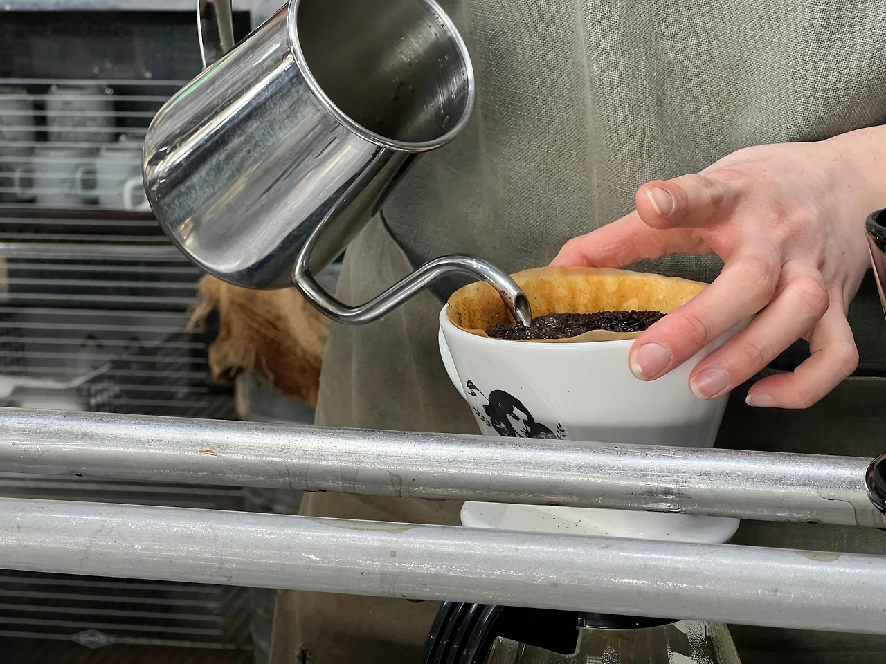 바리스타님이 드립포트의 주둥이 끝을 원두에 찌르며 드립퍼를 반바퀴 돌린다. 그리고 짧은 시간 텀을 두더니, 다시 원두에 점점이 찌르며 반바퀴 돌린다.