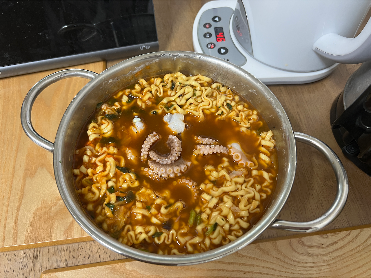 둘이서 해먹으려니 한번에 너댓마리가 고작이다. 쭈꾸미가 비싸기도 하지만, 비싼데 생각보다 큰 해산물이다. 한끼 식사에 두마리면 풍족하게 먹을 수 있다. 첫날 아침은 가볍게 네마리의 쭈꾸미와 함께 라면으로 시작. 라면을 그리 자주 먹지 않는 우리지만 너무 먹지 않아서 오히려 땡길 때가 있달까. 지난번 대통령 선거 날 안주 삼아 진짬뽕 컵라면을 하나 사와, 둘이서 나눠먹었는데 바깥양반이 그 맛에 혀가 당김을 느낀 모양이다. 마트에 갔더니 여지없이 진짬뽕 봉지라면을 한 번들 집어넣었다.