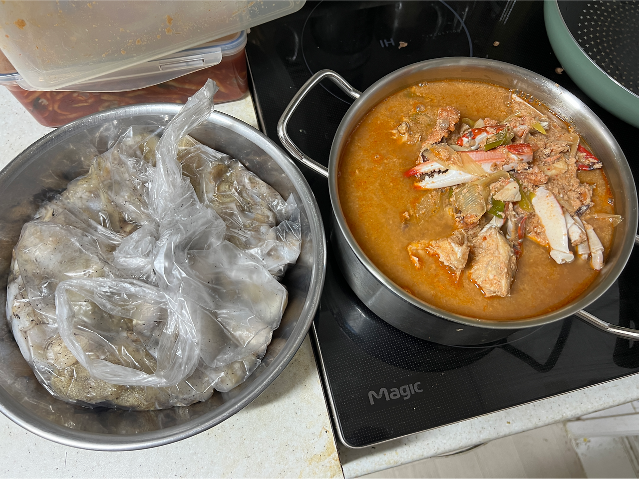 "꽃게 지져서 놓고 쭈꾸미도 사왔으니까 와서 가져가."