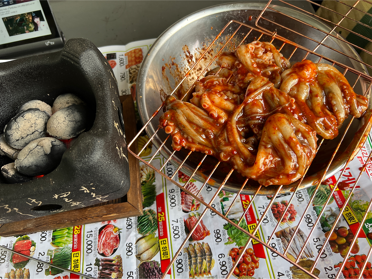 뭐어. 쭈꾸미 석쇠구이도 꽤 괜찮지 않아? 하는 마음인 것이다. 몇 해 전에 사두었던 미니 숯불구이용 화로. 이거 꽤나 쓸모없는 녀석이지만 그래도 쓰기로 한다. 별로 쓸데없었던 야자숯도 아낌없이 부어버렸다. 강한 화력으로 빠르게 구워버릴 테다! 라는 마음가짐이 필요하다. 아무리 화력이 강해도 그래봐야 숯인지라, 양념을 입힌 녀석이 빠르게 익어주진 않을 것이다.