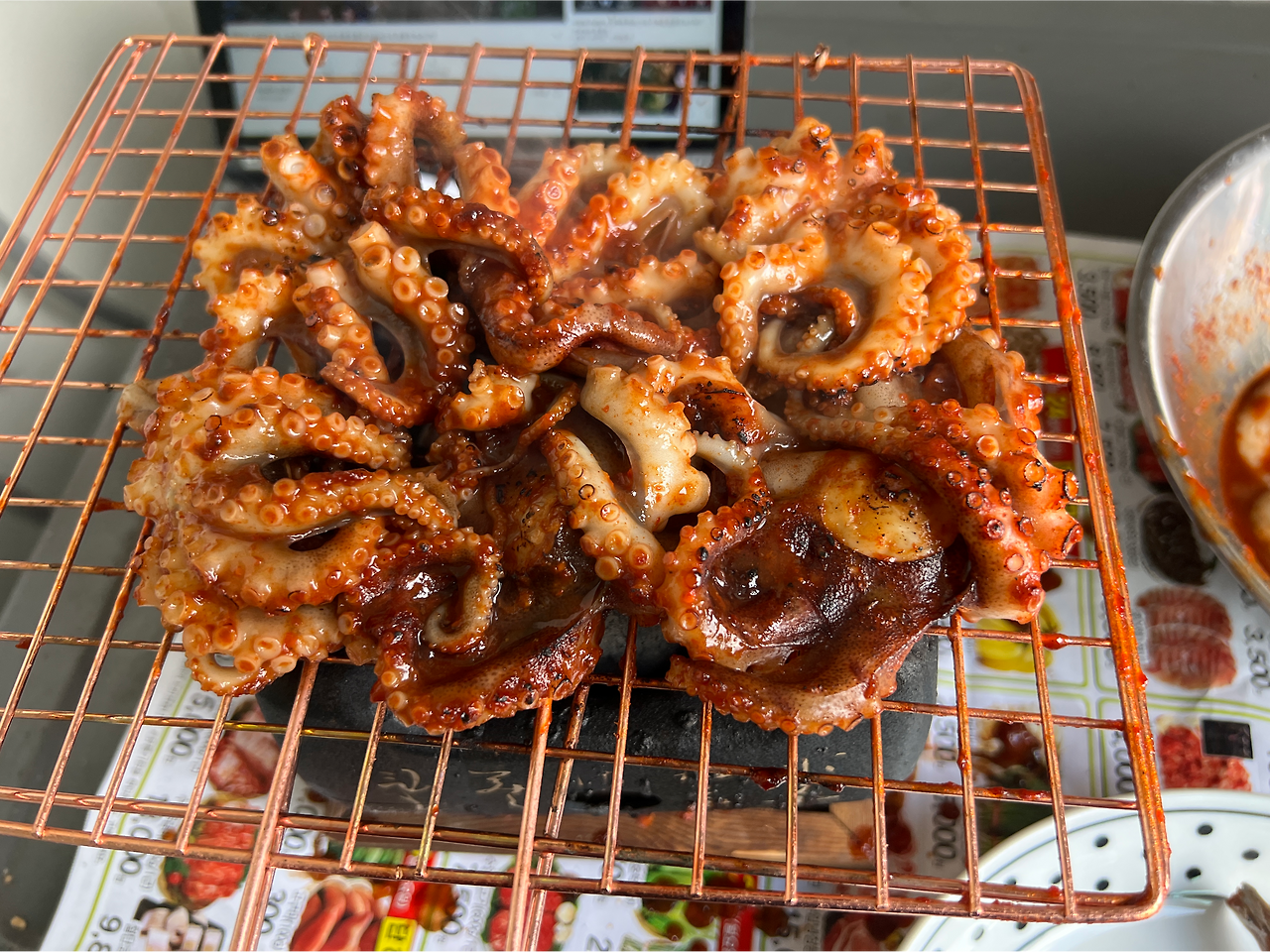 그것은 석쇠 구이 쭈꾸미. 나는 극혐하는 요리이고 바깥양반이 최애하는 요리다. 내 견지에서 석쇠구이는 쭈꾸미를 굉장히 맛없게 먹는 요리다. "쫄아붙기 때문"이다. 두족류 연체동물인 쭈꾸미는, 데치는 형식으로 짧게 조리하는 것 말고는 어지간해선 본래의 그 식감이나 수분을 유지하기가 어렵다. 숯불에 굽는다면 다른, 저온조리 장기조리가 가능한 식재료들도 얼마든지 있지 않은가.