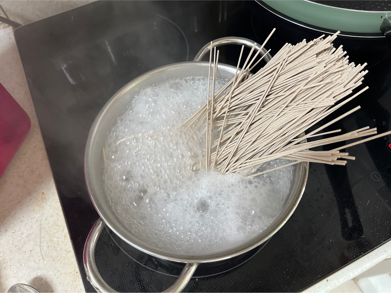 그런 돼지고기 육수에서 고기만 집어 꺼낸다. 면을 삶기 위해 물을 끓이고, 거기에 고기를 한번 데친다. 막국수에 올라갈 고기 고명이 너무 차가우면 못쓴다. 조금이라도 더운 김을 쏘여주면 훨씬 낫지. 이내 고기를 건져내고, 그대로 면을 던진다. 그리고 면이 익어가는 사이 고기 육수 냄비에 뜬 기름도 걷어둔다. 이미 돼지고기 육수를 내기 위해 냄비를 하나 썼으니, 면을 삶을 냄비는 알뜰히 고기만 데치는데에 써버리는 것이지. 그리고 딱 이정도만 되어도 좋다. 수육으로 따로 먹기로 한다면야 말렸다가 쪄서 쫄깃하게 먹겠지만 애초에 수육을 집에서 하려면, 맛있게 하려면 또 품이 드는 일이다.