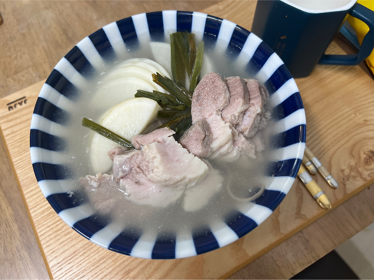 이틀 전 삶아서 식혀둔 앞다리살 수육과 그 육수를 뒷베란다에서 꺼내 가져왔다. 소금 약간, 마늘 한줌이 들어간 손바닥 크기의 앞다리 살은 한 술 후루룩, 육수 맛을 보니 깔끔하니 맛이 좋다. 한시간 남짓 우렸나. 싱싱한 고기라 그래서인지 돼지육수인데도 퍽 만족스럽다.