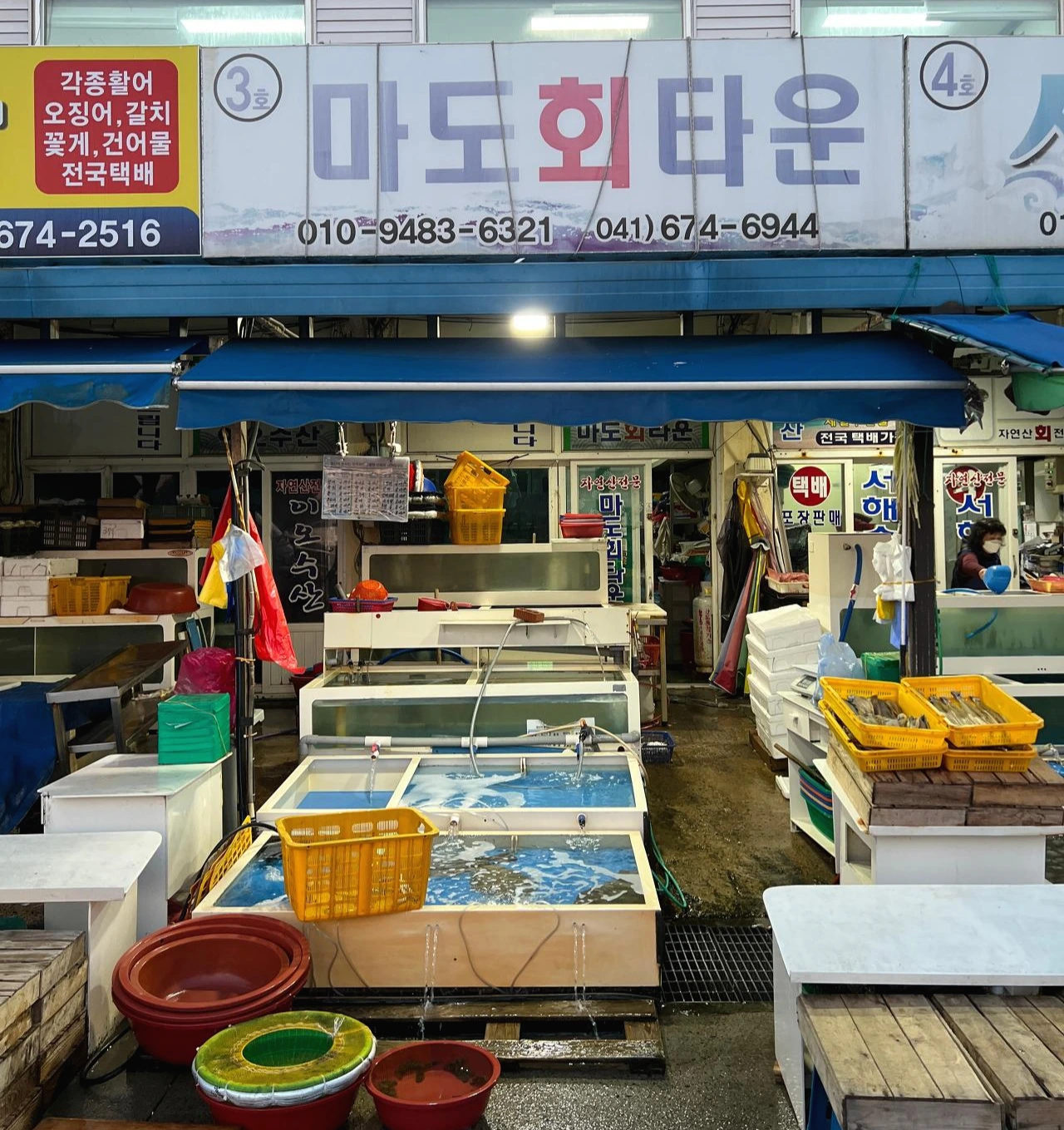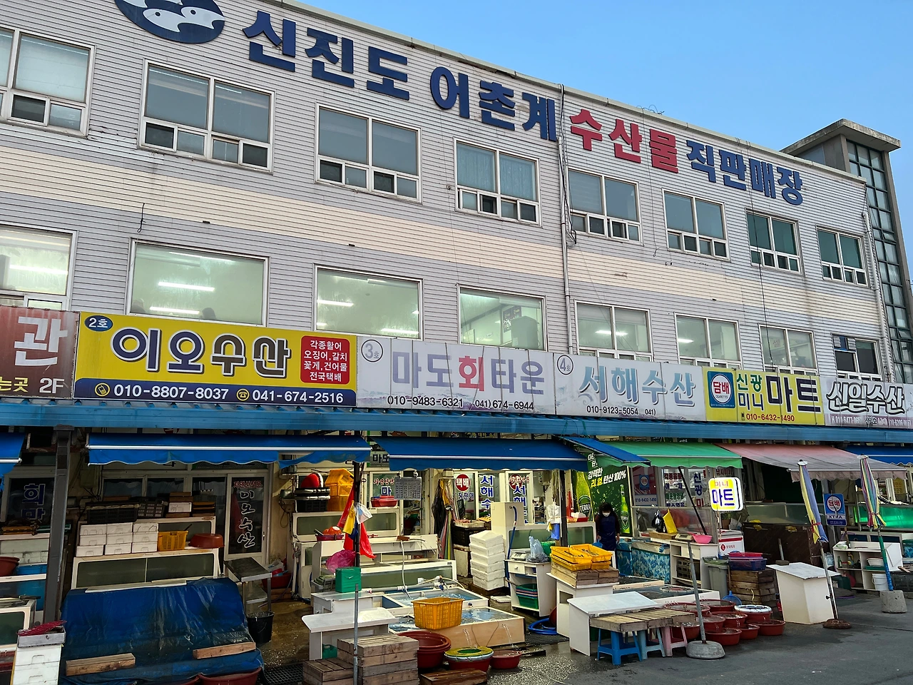 일행들이 먼저 숙소에 가 짐을 풀고 씻는 사이, 기획자인 나는 꽃게 저녁식사를 챙기기로. 신진도항 끝에 작은 어촌계 소매상들이 모여있다. 위층에는 먹고갈 수 있는 식당도 두 칸이 있다. 대규모로 손님이 밀려드는 관광지는 아니라서, 시설은 정말이지 작기만 하다. 그래도 맛만 있으면 되지. 건물 앞쪽 몇개의 소매상 중 두곳에서 꽃게를 하길래, 한 곳을 찜해 값을 묻는다.