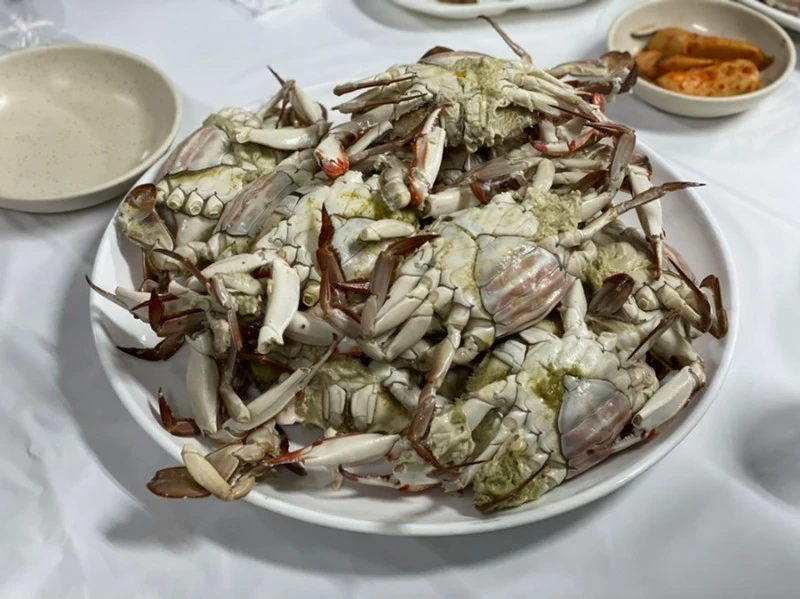 말이 나온김에 다시 말하자면 나는 실제로 젓가락질보다 꽃게 발라먹는 것을 먼저 배웠다. 시골 출신들은 으레 그렇다. 내가 시골에서 자란 것은 아닐지라도 외가는 유난히 또 친밀했기에. 가장 어린 기억의 언저리에, 집게를 파먹고 젓가락을 집게껍데기 안에 찔러넣어, 그것으로 집게를 오무렸다 폈다 장난치던 기억이 있다. 이제는 희미한 기억의 한 장면일지라도 그 기억은 지금까지도, 나의 꽃게 미식의 품격과, 꽃게의 수율을 한껏 높여준다. 나는 세심하게 집게다리를 발라, 일행에게도 나눠주고 아내에게도 주었다. 정말로 알이 꽉~찬 꽃게는 등껍데기 양쪽 끝까지 꽉꽉 주황색 알, 아니 사실은 알은 아니지만 알이라고 불리는 그것을 채우고 있고, 우리가 생각보다 식당에 닿는 것이 늦어서 다소 과숙되긴 했지만, 꽃게는 정말 잘 쪄져서 감칠맛이, 그야말로 최상이다.