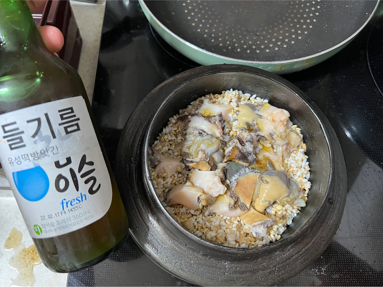 그렇다 이것은 중국산 들깨이긴 하지만 국산 들기름보다 6천원이 저렴하긴 했지만 그래도 12천원짜리 시골방앗간에서 직접 짜낸 들기름인 것이다 어머니 생신 겸 외할머니 제사 겸 하여 엄마를 모시고 가족과 태안을 나는 지난 주에 또 다녀온 것이다 미리 하동에서 사 와 길들여둔 무쇠솥이 있었고 그런데 하필이면 딱 이 타이밍에 아파트 단지에 완도산 전복이 들어왔다고 하여 가서 한봉지 예닐곱마리를 샀고 그때 바깥양반은 오빠 전복 사자 솥밥해먹자라고 하여 나는 전복을 샀는데 마침 들기름도 거의 다 떨어져가서 들기름을 사면 좋긴 하겠지 하고 태안 가기 전날에 전복을 샀고 그다음에 태안 가서는 들기름을 사기 위해 기름집을 찾아서 사 온 들기름 아 그런데 전복이라 전복 전복은 개인적으루다가 좋아하지도 않을뿐더러 귀찮기까지 한데 바깥양반이 전복솥밥을 하시자 하니 아니할 수 없는 내 마음 전복솥밥 아 너의 이름은