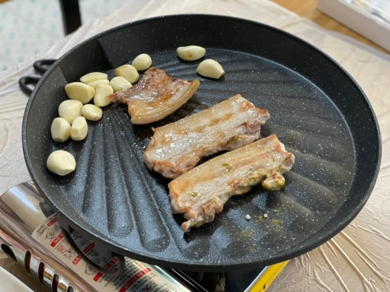 소금을 살짝만 치고 그 위에 녹차가루를 뿌린 삼겹살. 그리고 통마늘이 나왔다. 그리고 전기버너에 묵직한 철판이 올려진다. 이 시점에서 "별것 아니군."하는 생각이 들었지만 가게 안의 풍경은 조금 달랐다. 주방을 낀 메인홀에서는 사장님의 따님이 엄마에게 존댓말을 꼬박 쓰시며 가게 일을 돕고 있는데, 일하는 차림은 아니다. 한 눈에 주말이라 가게 일을 돕고 있는 것을 알았다. 가게의 옆칸에는 7,8명의 일가족이 와서 식사중이다.사장님은 우리 상을 차리는 한편 김치찌개며 반찬이며를 나르느라 분주하다.