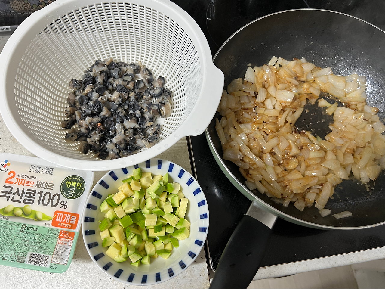 강된장을 일단 해주기로 했다. 바깥양반이 좋아한다니, 또 나도 좋아하는 고로 이야기 나온 김에 한 통 만들어놓으면 한 일이주는 두고두고 쌈야채로 건강식이 될 것이다. 주말에 마트에 들러 애호박과 두부, 우렁을 사뒀다가 이틀쯤 뒤에 시간이 마침 생겨 조리 시작. 양파를 미리 쫑쫑 썰어 볶아 풍미를 내면서 우렁을 씻고 채반에서 물기를 털어낸다. 강된장에 들어갈 수 있는 재료가 여러가지 있지만 요정도로만 간소하게.