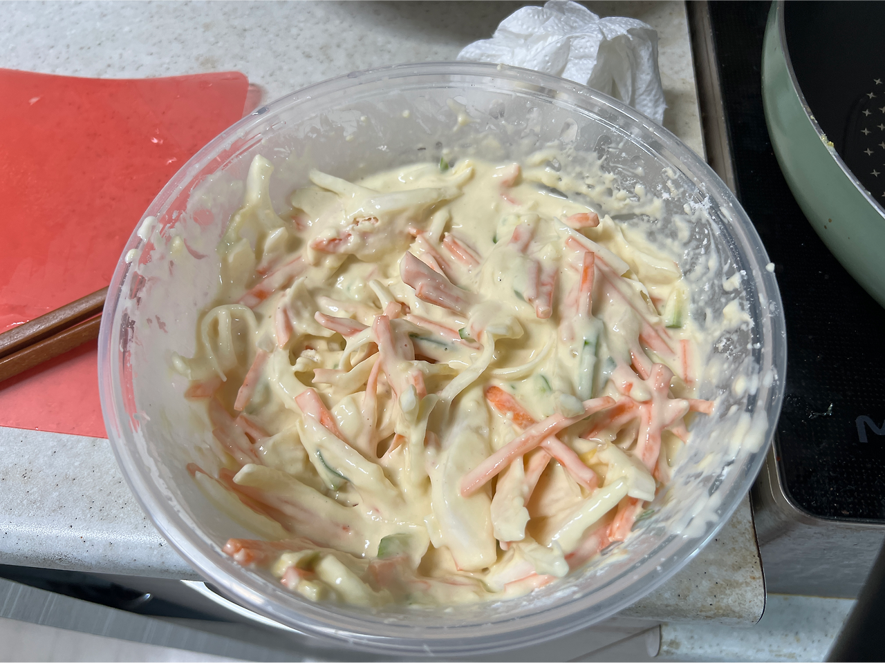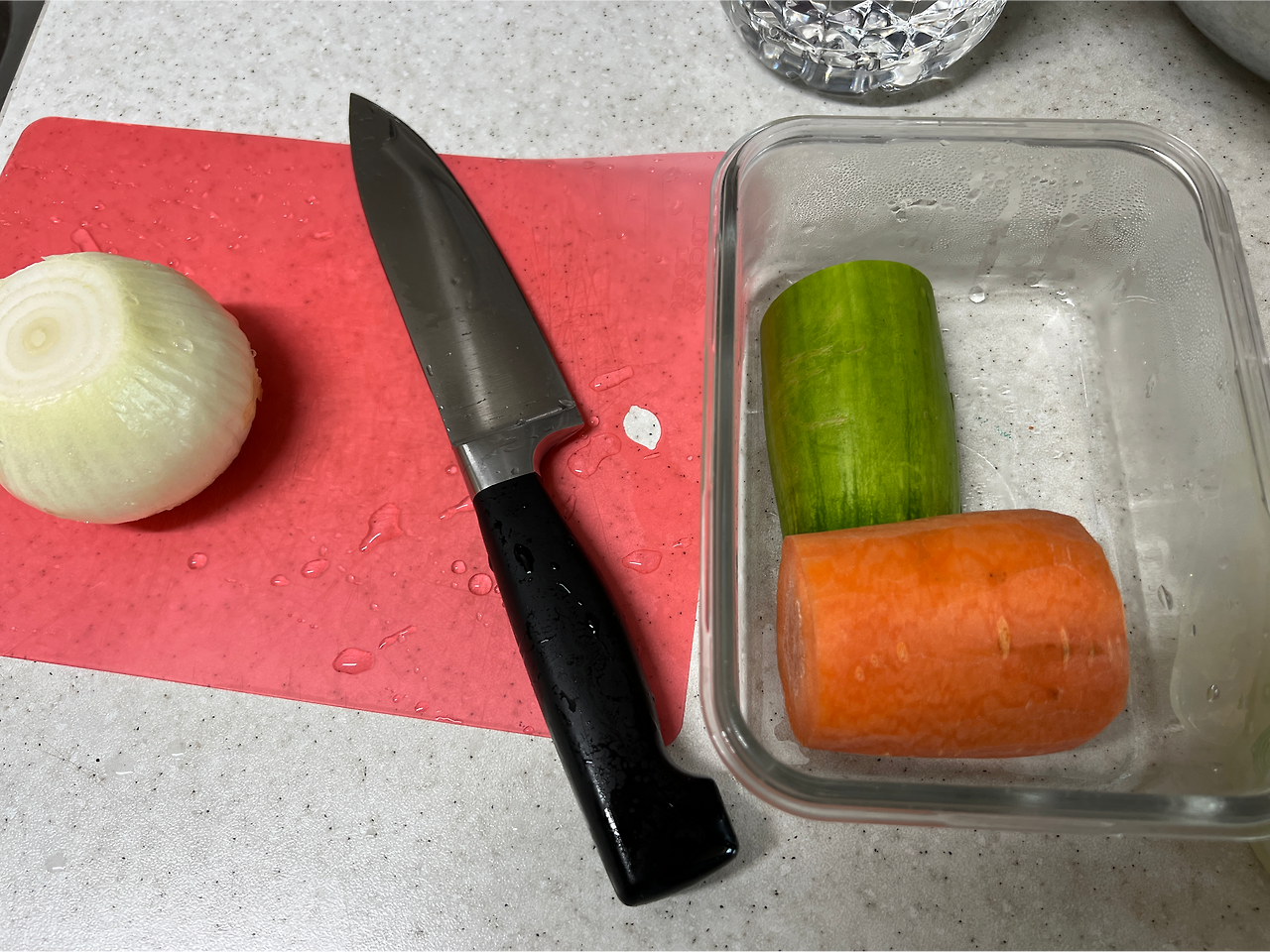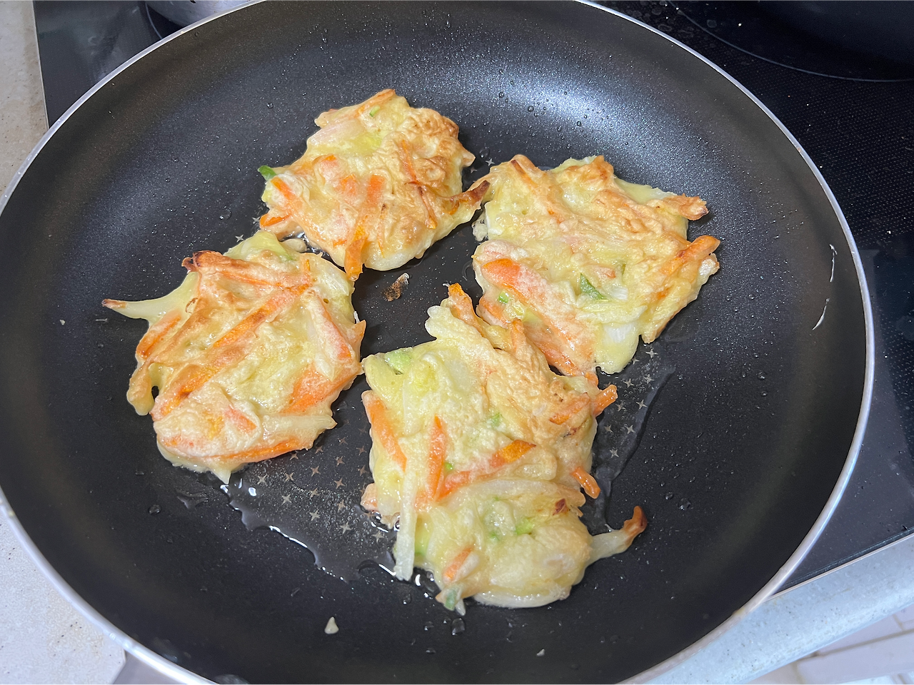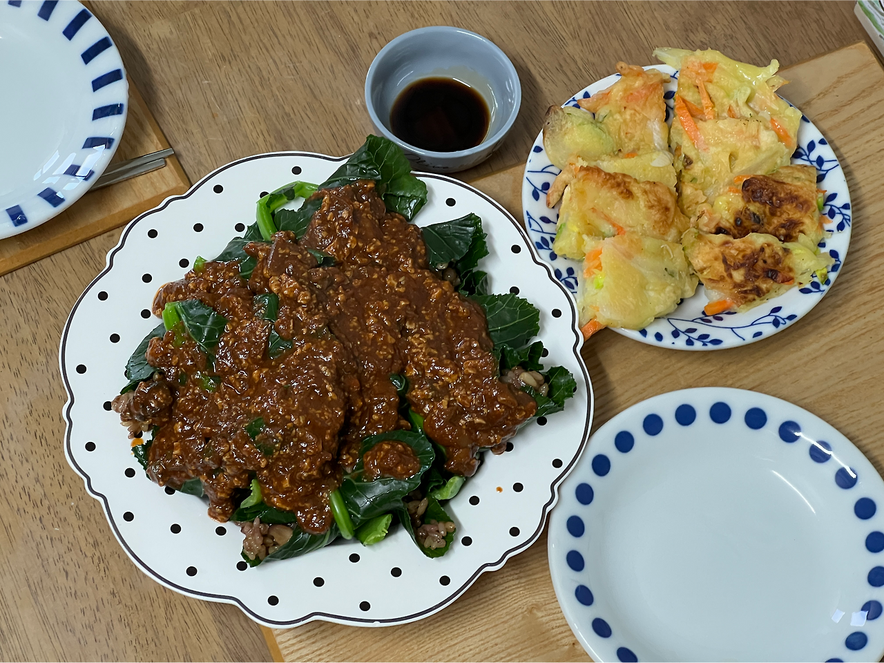 쌈을 할 케일까지 데치고 나니 강된장을 만드느라 다듬고 남은 채소들이 눈에 들어온다. 당근은 이전에 다른 걸 하느라 쓰고 남은 걸 꺼냈다. 여기서 나의 고민은 "구색"이었다. 강된장쌈밥을 만드는 건 별일이 아니다. 그런데 상차림이 지나치게 간소해질 것 같다. 애초에, 쌈채소를 넉넉히 상에 깔아두고 다른 반찬을 올리고 밥공기를 차리는 게 아니라 케일로 쌈을 싸서 한 접시 올리는 거라. 구색이 별로이고 색상도 별로다. 이미 호박이며가 남아버렸으니 이왕이면, 상차림의 구색을 맞추어주기로 했다. 나는 야채를 채를 썰고, 야채부침개를 만든다.