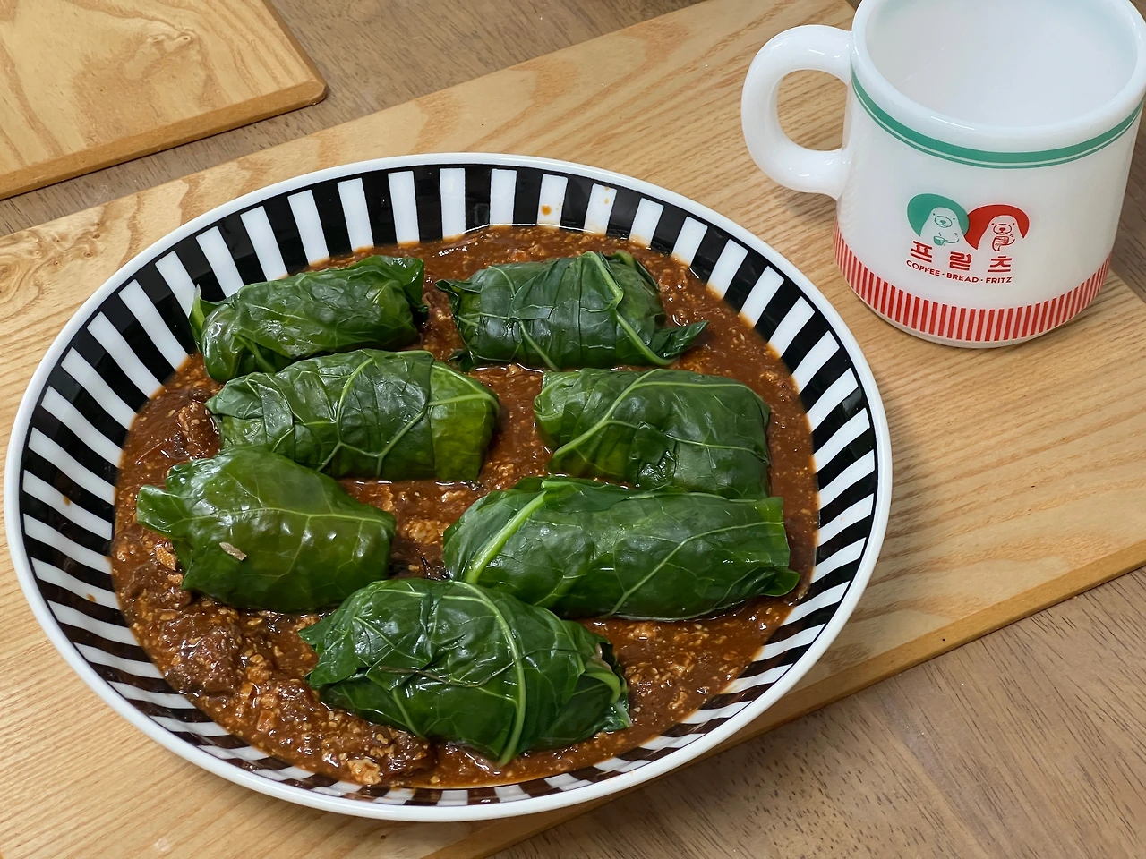 두가지 이유가 있다. 일단 장모님까지 세 사람이 먹을 거라서 어떻게 쌈을 만들어도 접시는 넘친다. 그래서 사진처럼 예쁘고 아리땁게 강된장이 담겨진 접시 위에 쫑쫑쫑 쌈이 올라가지지 않는다. 또 다른 이유는, 그렇게 접시에 깔고 위에 쌈을 올리면, 대부분의 강된장은 결국 남아서 버려지게 될 것이다.