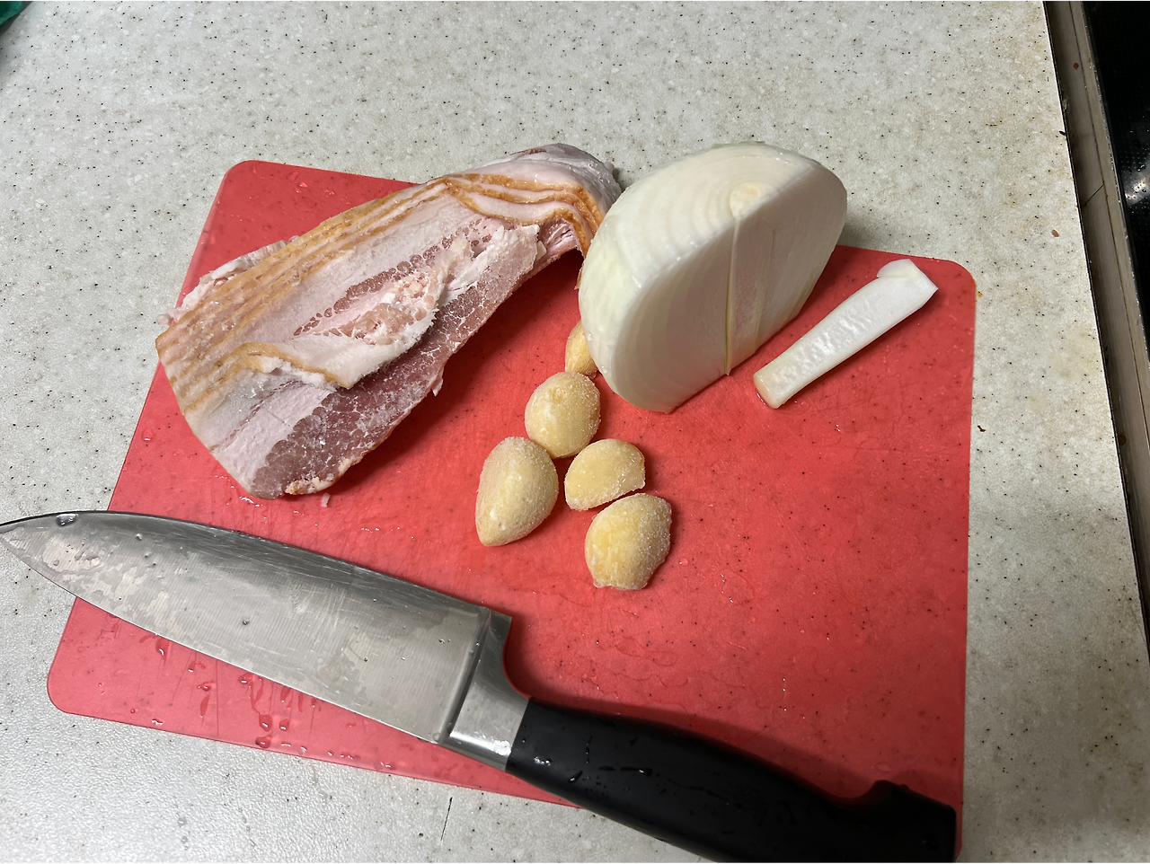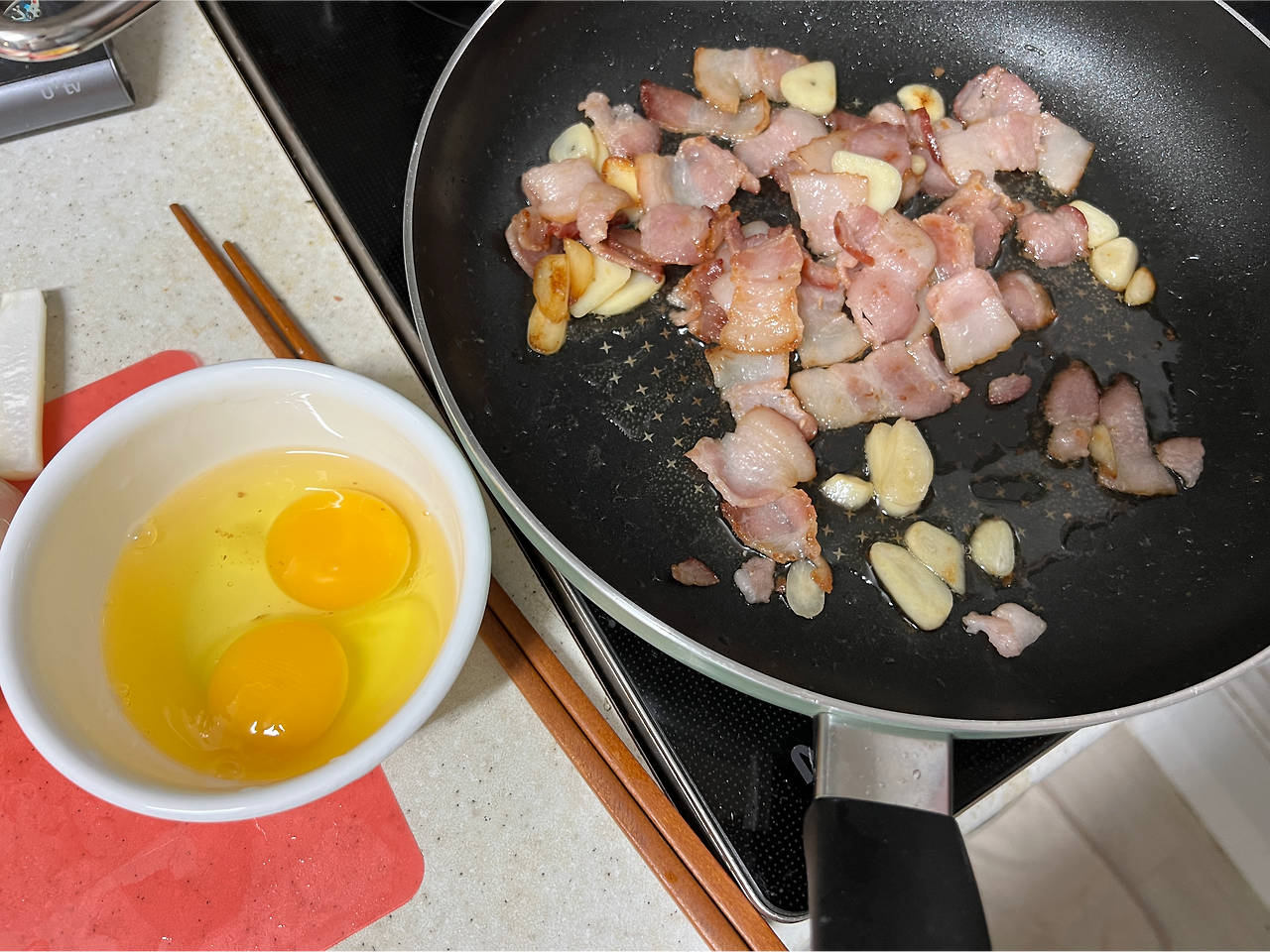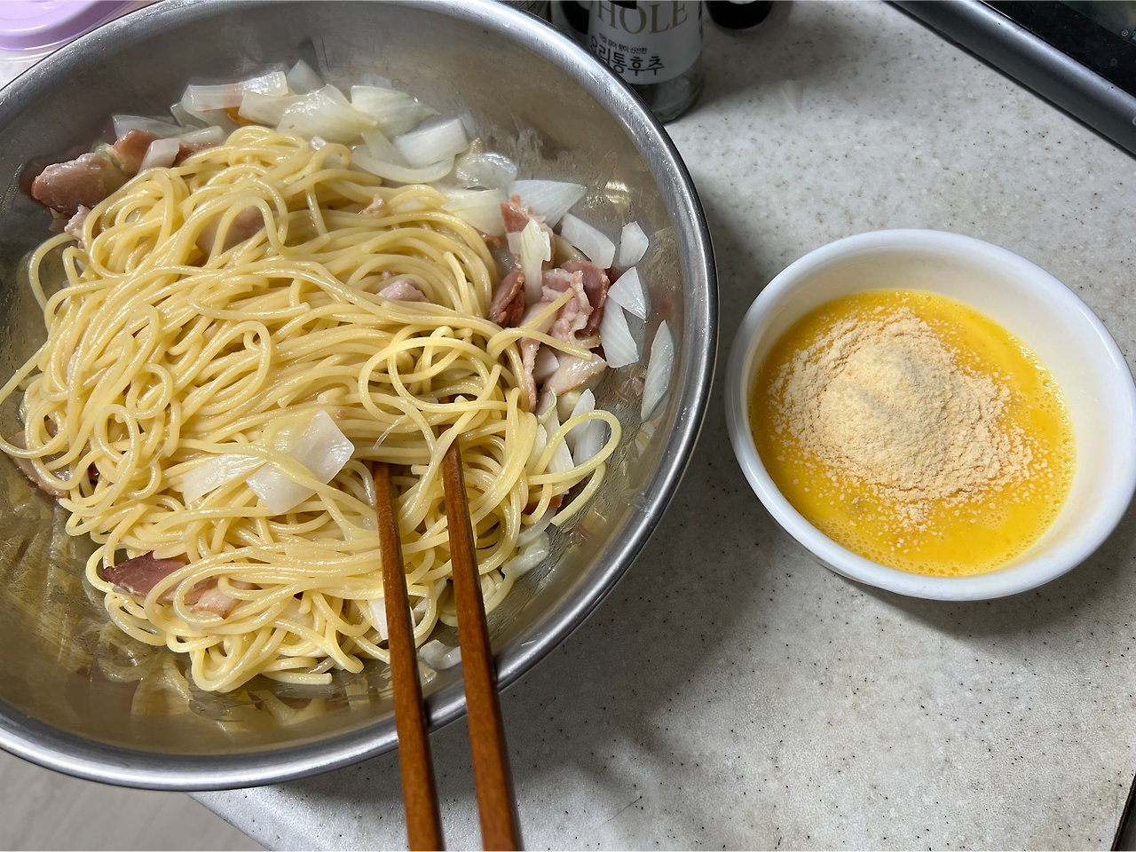 인터넷에서 찾은 레시피대로 면은 대강 먼저 삶아서 뒀다. 그리고 지글지글 베이컨과 마늘을 볶은 뒤 계란소스를 만든다. 계란소스라기보단 그냥 날계란을 두개 풀어놓고선 늘 그렇듯 면이 생각보다 많아서 계란을 하나 더 풀었다. 왜 늘 파스타면은 나도 모르게 많이 해버리는 걸까.