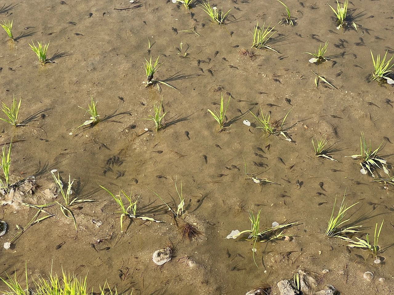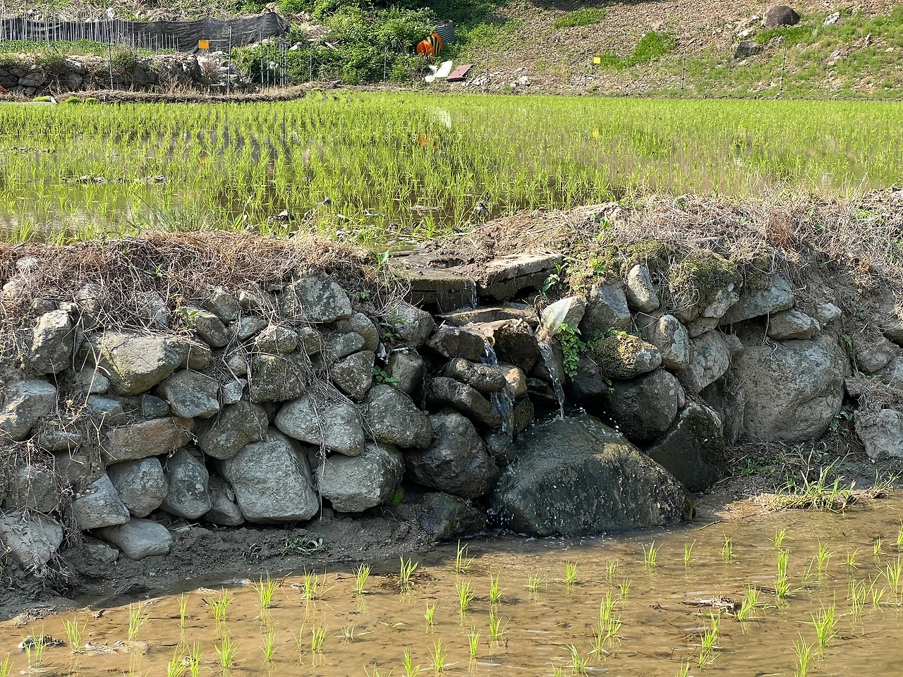 졸졸졸 흐르는 세찬 논물 소리. 반가워 한걸음 다가서 사진을 찍으려다 깜짝 놀란다. 턱 바로 아래 수십마리의 올챙이가 더운 헷살을 받으며 헤엄쳐 달아난다. 올챙이라. 여름철이 되면 개굴개굴 밤 새 시끄럽겠구나. 이만큼이나 많은 개구리들도 여름을 지나, 가을이 지나, 살아남는 것은 불과 수십마리. 그러니 또 겨울잠을 깨고 살아남아 알을 낳고 봄을 맞겠다.