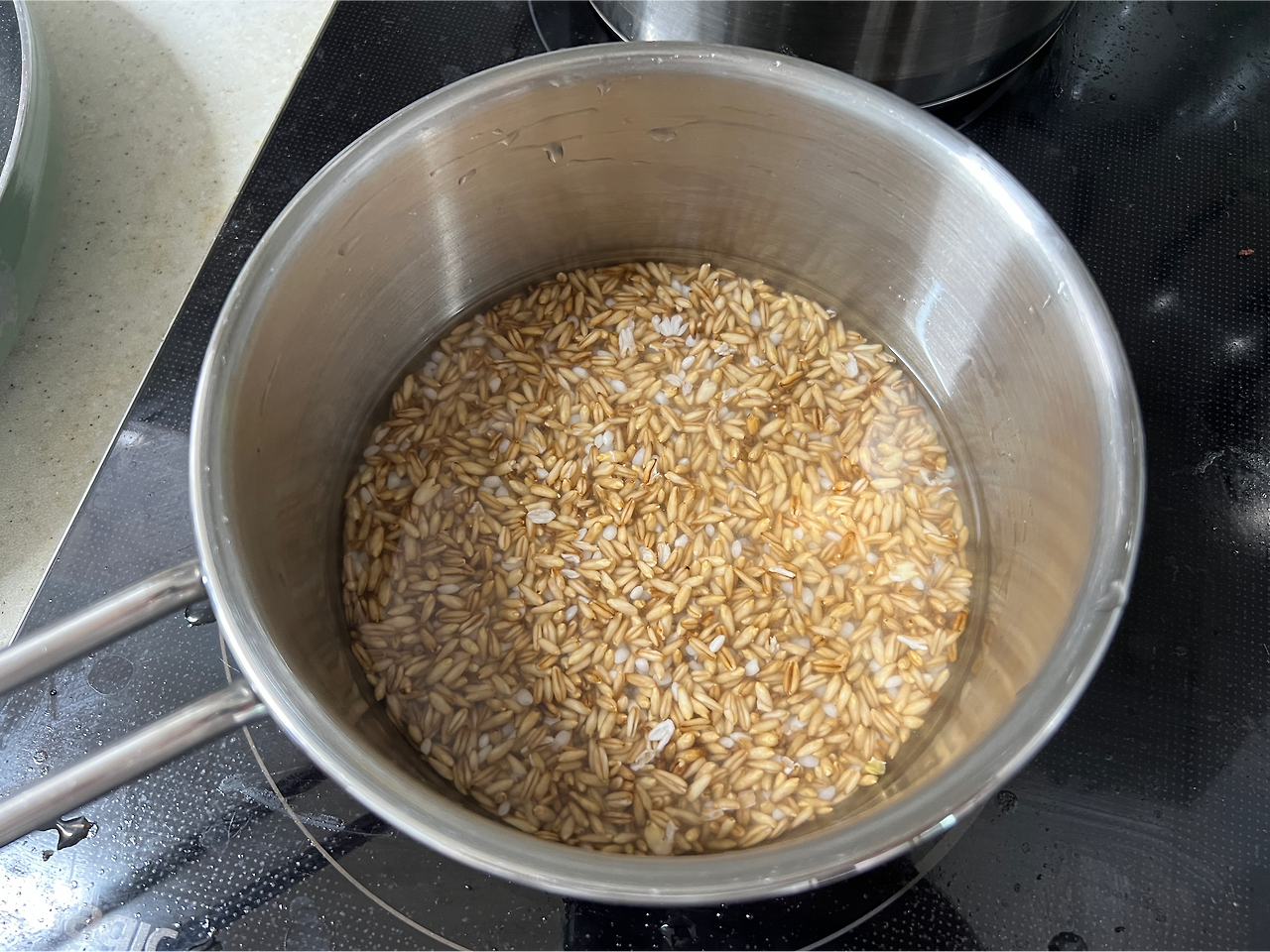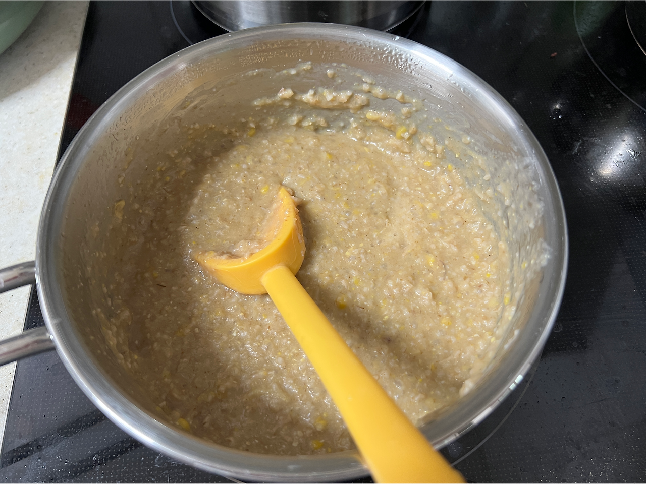 귀리와 백미, 그리고 간 옥수수와 한우에 물 반컵을 더하여 이게 폴폴 끓이기만 하면 끝이다. 귀리와 쌀이 덜 갈린 부분도 조금 있고 해서 쌀가루 미음보다는 충분히 충분히 오래 저어주며 약불에서 끓인다.