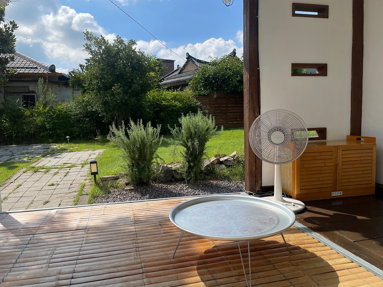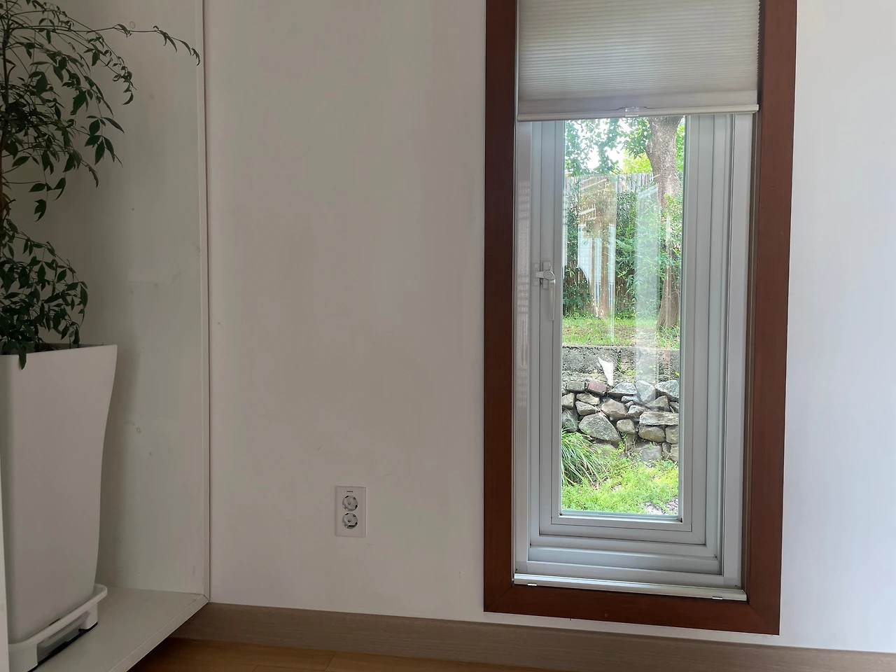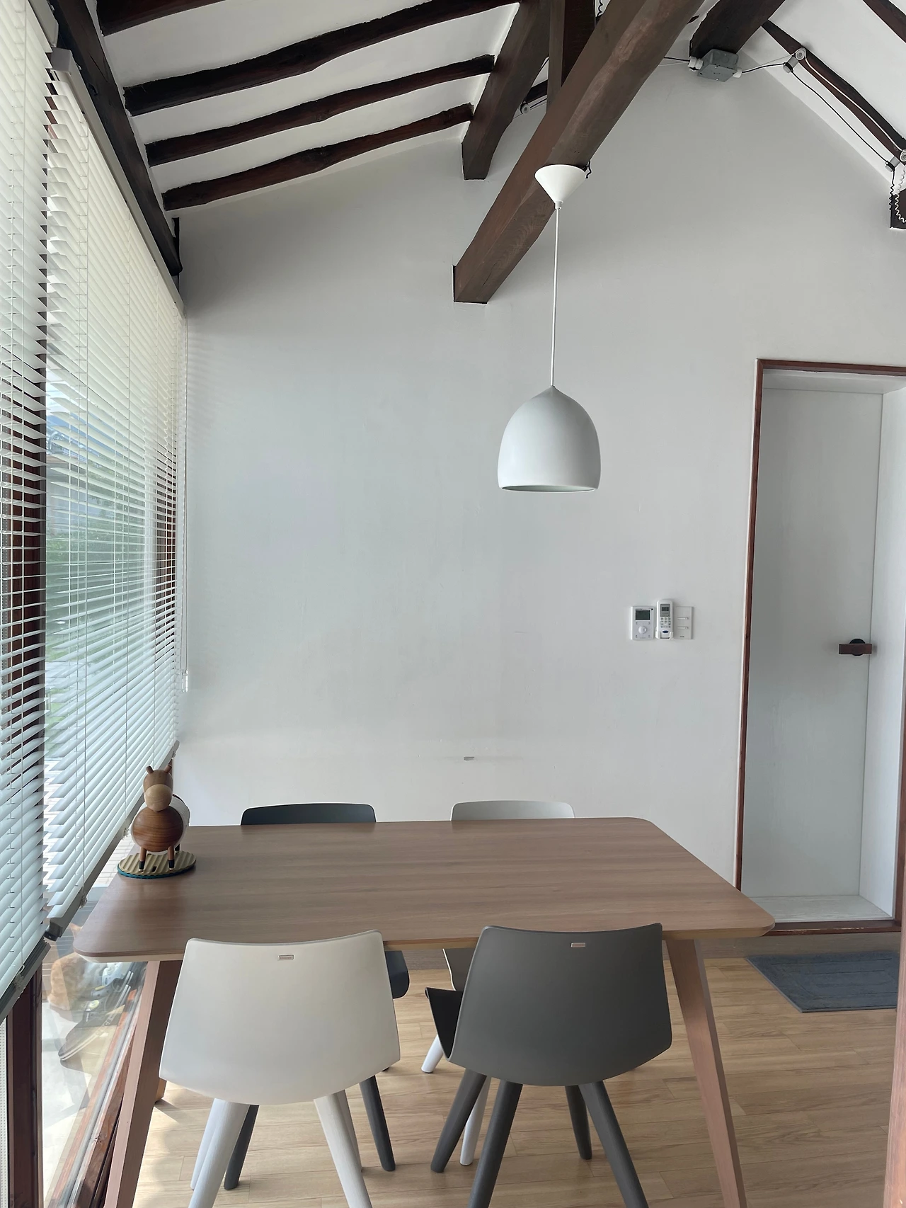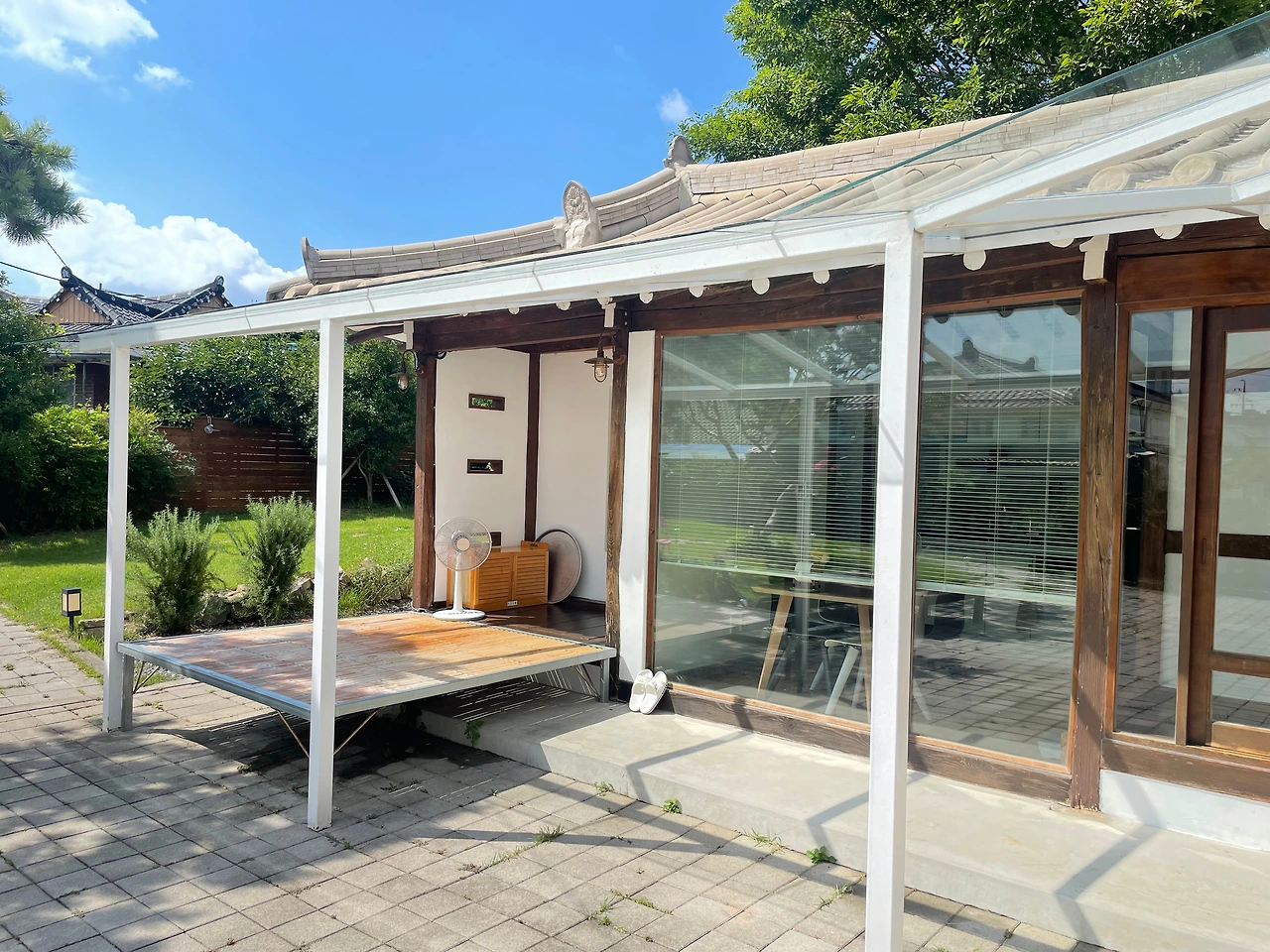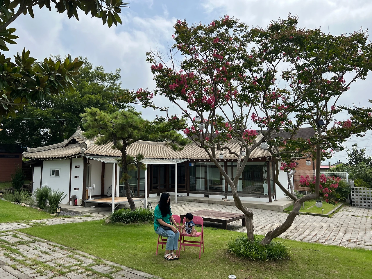 툇마루를 감싼 유리벽 안에 아이를 놓아두고 나서 나는 짐을 옮기기 위해 다시 서둘러 차로 돌아왔다. 한달살이는 아니고 하루살이 숙박이다. 그런데 청명한 날씨에 녹음과 어우러진 옻칠 잘 된 나무의 질감이라니. 이렇게 아름답고 평안한 풍경일 수가. 일반적으로 아내의 여행지 선정이나 숙박은 모두 일임하고, 따르고 있지만 이렇게 내 마음에 쏙 드는 곳도 처음이다. 넓은 마당하며, 마당 가운데 평상, 그리고 처마를 연장해 또 하나의 평상.