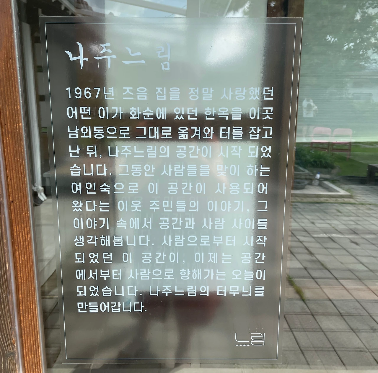 그리고 마침내 훌훌, 자리를 털고 일어나 잔을 치우고 음식물 쓰레기까지 치운 뒤, 마지막으로 집을 둘러보며 문을 닫았다. 우리는, 다시 여름의 공기에 쏟아져나왔고, 이제 긴 여행길을 다시 준비한다. 중간기착지라는 그 이름답게, 서울과 제주의 중간 지점, 나주에서 만난 이 공간에 정말 하루 편안했다. 나가기 싫었을만큼. 나가기가 어려웠을 정도로.