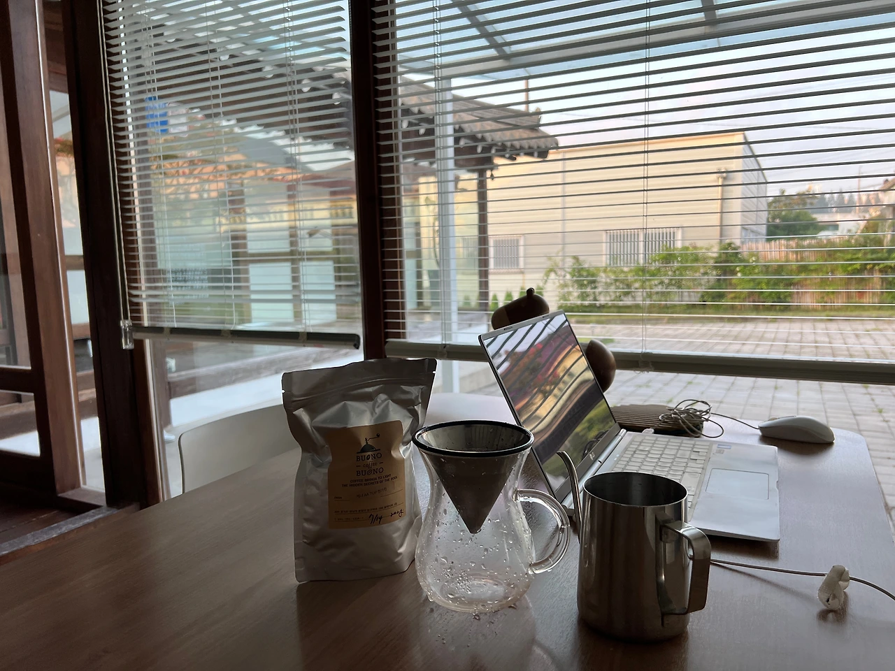 그런 생각으로 맞이한 아침. 나는 나주의 여름 새벽 공기를 맞기보다, 이곳에서 커피를 마시며 업무를 하는 것을 택했다. 해야 할 일은 많다. 아직 해가 완전히 뜨기 전, 먼저 일어나 아이 분유를 좀 챙겨먹이고, 호젓하게 앉아 커피를 내리기 시작한다. 앗, 이내 아이가 깨었다. 두시간 가량, 놀아주고 나니 아홉시. 30분 정도 겨우 혼자 시간을 보낼 수 있었다. 그 뒤엔 이제 출발 준비를 해야 한다. 혼자 아침 반신욕을 위해 물을 한번 더 받았다. 그리고 나니 이제 출발 시간이 되었다. 비록 아기로 인해 분주한 아침이긴 하나, 이곳이어서 그 안에만 갇혀있어도 좋았다.