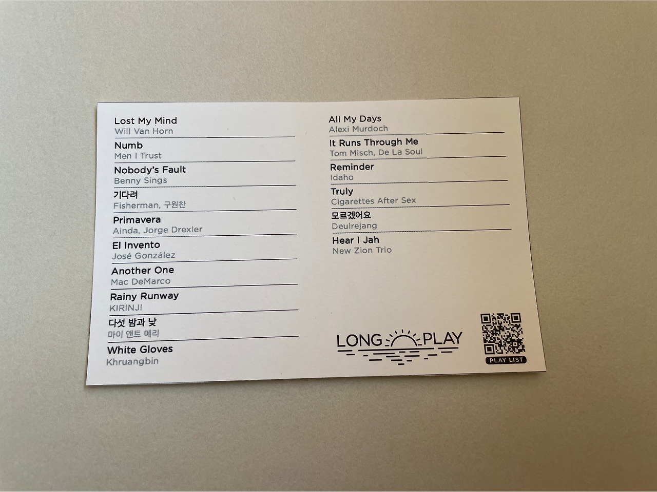 커피도 커피이지만, 선곡한 셋리스트를 예약 손님들에게 배부한다. 16곡이니, 대강 1시간을 딱 채울듯하다. 우리야 당연히 아기 때문에 음악을 들을 짬은 조금도 없어서 아쉬웠지만 커피에 즐기기에, 음악에 몰입하기에도 좋은 카페. 예약제 덕에 15명 규모의 홀엔 10명 이내의 사람들만이 자리하고 있었고, 딱 1시간이 되자 다들 알아서 자리를 정리하고 일어났다. 몇시까지 하는지 모르겠는데 음악까지 즐기고 싶다면 늦은 시간에 찾을수록 좋지 않을까. 예약에 성공했을 때의 이야기긴 하지만, 긴 하루를 보내고, 관광으로 진력을 좀 소진하고, 많이 걷거나, 헤엄을 쳤거나, 전날의 숙취로 몸이 노곤할 때, 떠들기보단 귀 기울이며 커피에든 음악에든 사람에든, 열린 마음이 될 수 있는 시간에 머물기 좋은 곳.