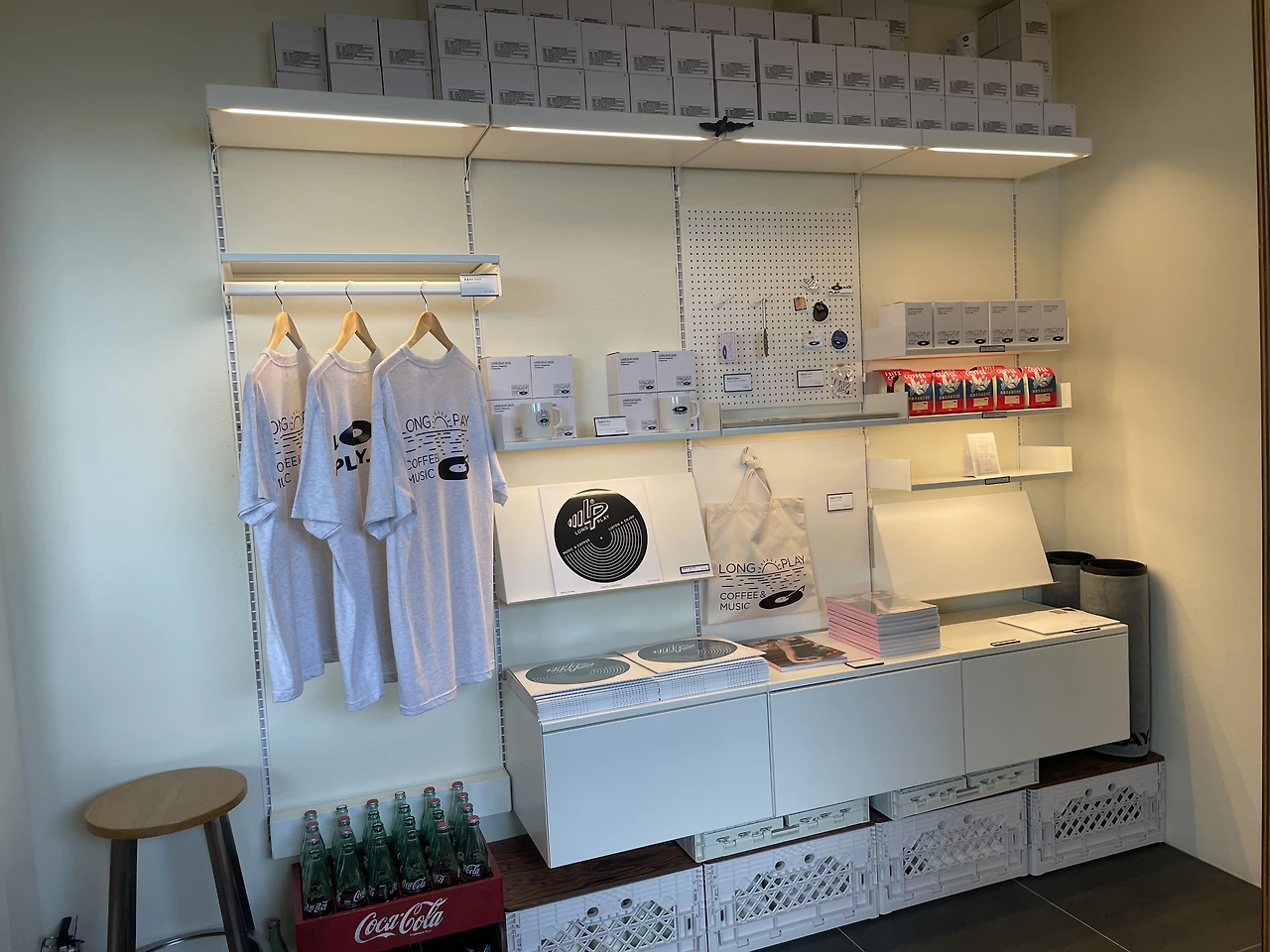 입구 쪽에 위치해, 카페에 들어서면 먼저 발견하게 되는 소품 매대엔 퍽 여러가지로, 머그컵, 식기받침, 에코백, 그리고 요가매거진, 그리고 설마 싶은 요가매트에(설마, 저걸 팔 것 같진 않으면서도, 설마 여기까지 와서 새벽에 이효리씨가 요가를 하기 위해 매트를 가져다 놓은 것은 아닐테고), 티셔츠까지 여러가지 구비되어있는데, 거기에 콕 하고 병 콜라가 자리를 잡고 있다. 아니 그걸 보고 나는 힙스터스러운 인테리어 소품인가 생각했었는데. 이상순씨, 아니 이상순 대표님이 병콜라를 즐기는 취향이라, 심지어 병콜라를 메뉴에 넣어놓았다니.