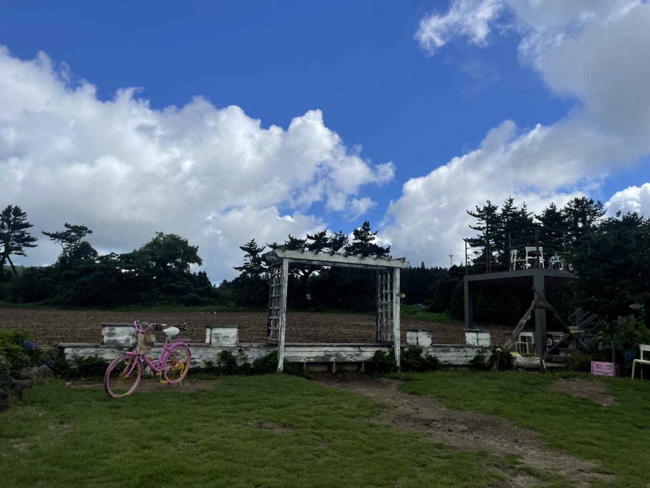 뒷마당은 테이블도 있고 포토존도 마련되어 있다. 아주 더운 날씨였긴 하지만 아이를 앉히고 사진을 찍었다. 조금 선선한 날엔 여기 앉아서 하늘빛을 즐기는 게 제법 호사가 될 것 같다.
