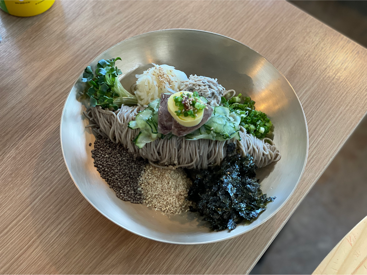 그러나 그보다, 메밀을 직접 만들어서일까, 물을 따르려는데 플라스틱 물병이 따끈따끈하다. 황금색에 가까운 그 물을 따르니 구수한 향이 번진다.