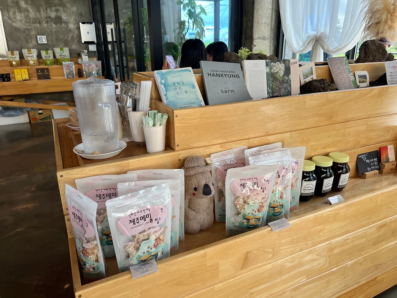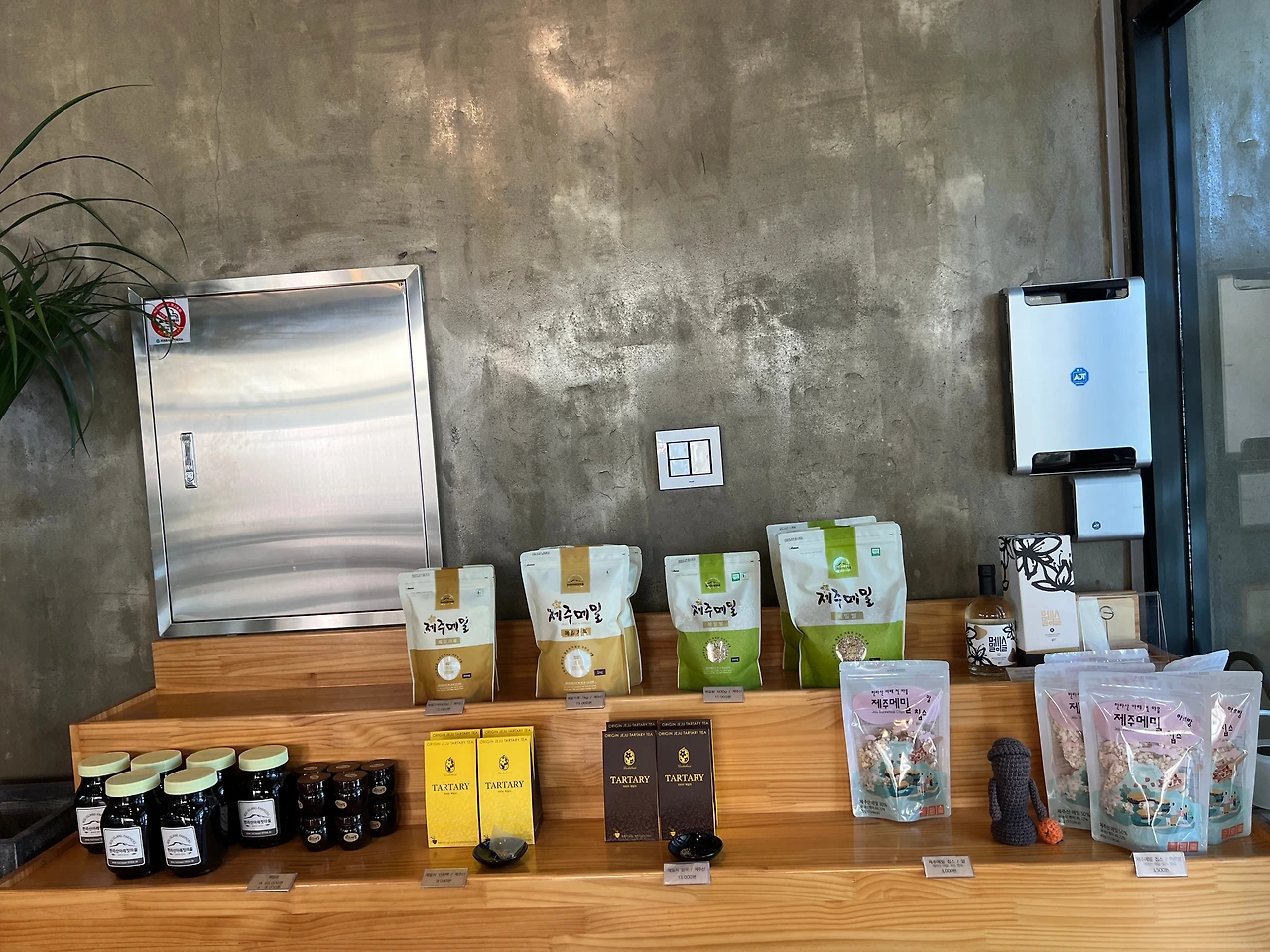 더 재미있는 것은 식사를 마치고 작은 뒷마당과 옆 카페를 둘러보기에도 소소한 즐거움이 있다는 점이다. 카페에 식사 대기를 기다리는 사람이 제법 많다. 식당이 외진 산간마을이라 주변에 딱히 유명한 카페도 없고, 여기서 그냥 순번을 기다리는 분위기다. 그런데 메밀로 만든 상품들이 조금 있어, 구경을 하기도 좋다. 원래 봉평 등, 메밀 산지를 가면 거기서 메밀 가루는 웬만하면 사오는 편인데, 여기선 메밀가루는 아깝게도 팔지 않는다. 아깝다. 있으면 살 뻔 했다.