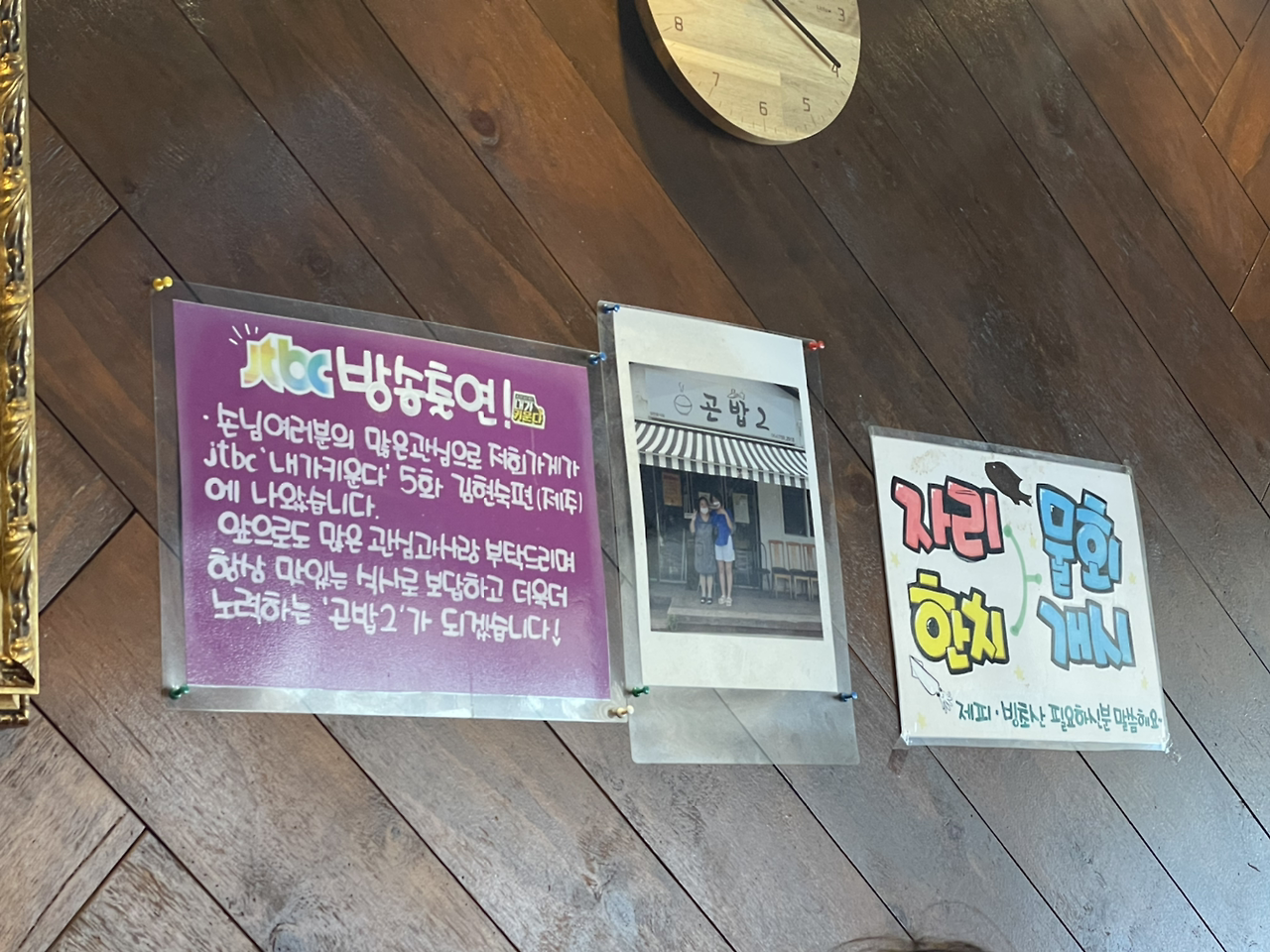 우리는 26번이라는 황당한 대기순번을 받아, 마트와 카페를 들러 두시간이나 보낸 뒤에 겨우 곤밥2에 입장할 수 있었다. 어마어마한 대기시간. 그런데 자리에 앉아 가게를 둘러보니 POP 아트로 저런 재미난 팻말이 붙어있다.