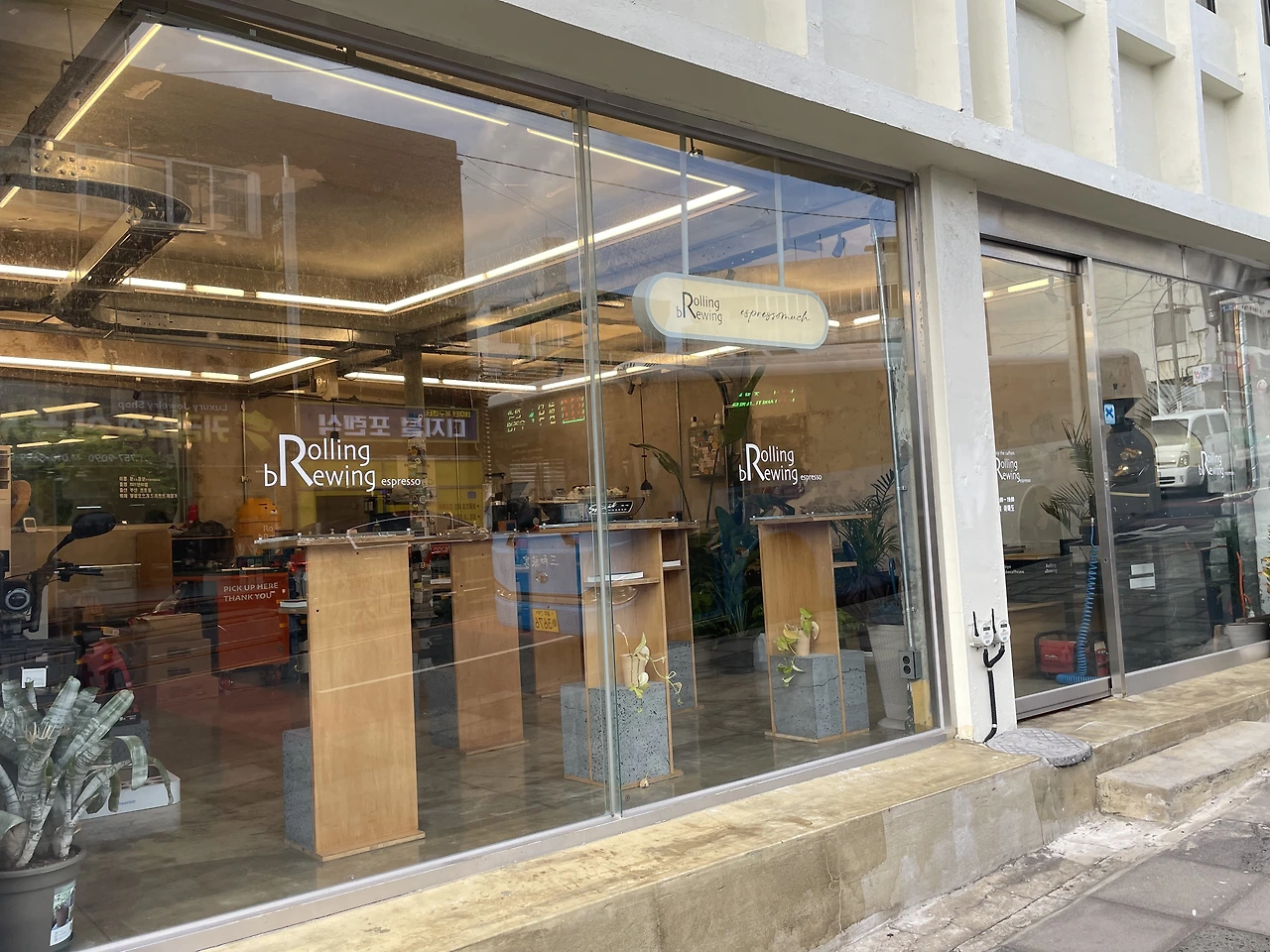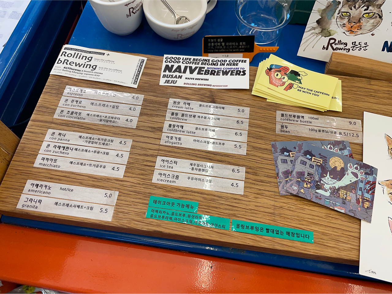 동문시장 앞 삼거리 한켠에 위치한 롤링브루잉은 큼지막한 고양이가 한마리 있다. 아내는 고양이조차 무서워하기에 미리 나에게 고양이는 훠이 훠이 멀리 해 달라고 요청까지 한 참이다. 그러나 고양이는 곤히 잠들어 있고, 힙하고 트렌디한 1층 실내를 구경하며 콜드브루 하나, 에스프레소 하나를 시켰다. 그리고 맛을 보라고 두 종의 콜드브루 시제품을 사장님이 내어주셨다.