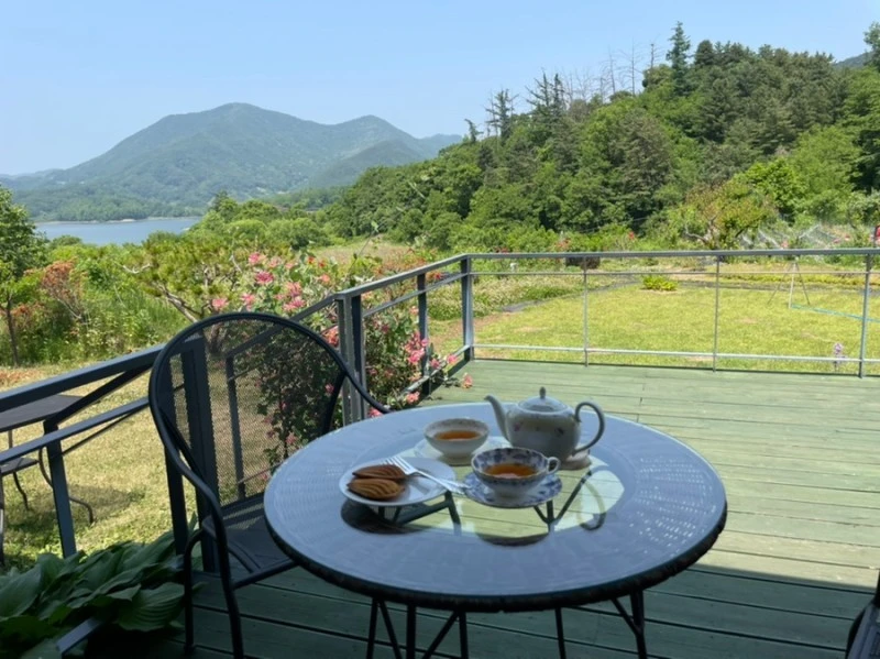 아름다운 풍광을 앞에 두고 드디어 홍차가 나왔다. 사실 다도라는 절차를 생각해 볼 때 티가 빨리 나오는 것도 좀 우습다. 주전자를 데워야 하고, 그 데워진 주전자에 물 온도를 맞추고 등등. 답답해 할 이유가 없는 것이 홍차이고 그런 기다림까지 티타임의 일환인 게다. 다행히, 소정의 홍차는 검증된 제품들의 품질 덕일까, 익숙하고 만족스러운 맛. 특별할 것이 없지만, 특별할 이유도 없는 맛. 웨딩임페리얼이 기대대로의 향을 풍기고 있다. 먼저 이것을 둘이 나누어 마시면서 천천히, 구름 한점 없는 하늘과 초록초록한 5월의 산야를 바라본다.