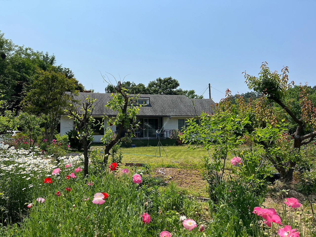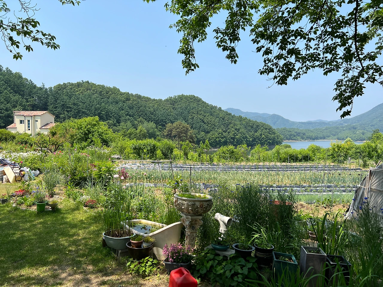 이 버스정거장 맞은편엔 정구장이 있다. 테니스장도 아닌 정구장이라니 세상에. 마침 우리가 방문한 시기가 햇살 좋은 5월인지라 초등학교 총동문회의 체육대회가 있었고, 그래서 왕복 2차선 도로 건너편으론 제법 왁자지껄한 흥겨운 함성이 들려오고 있었지만, 그런 소란스러움이 조금의 방해가 되지 않을만큼, 소정의 작고 낮은 문을 넘어서면 이곳은 신세계. 산을 낀 대청호가 저 멀리 내려보이고, 그 사이로는 간간히 채소밭. 그리고 홍차가게 주변으론 잘 조경된 꽃나무들이다. 그리고 마당 한가운데는 스프링클러가 빙글빙글 돌고 있어서 이 화창한 날의 풍경에 딱 좋은 치장이 되어주었다.