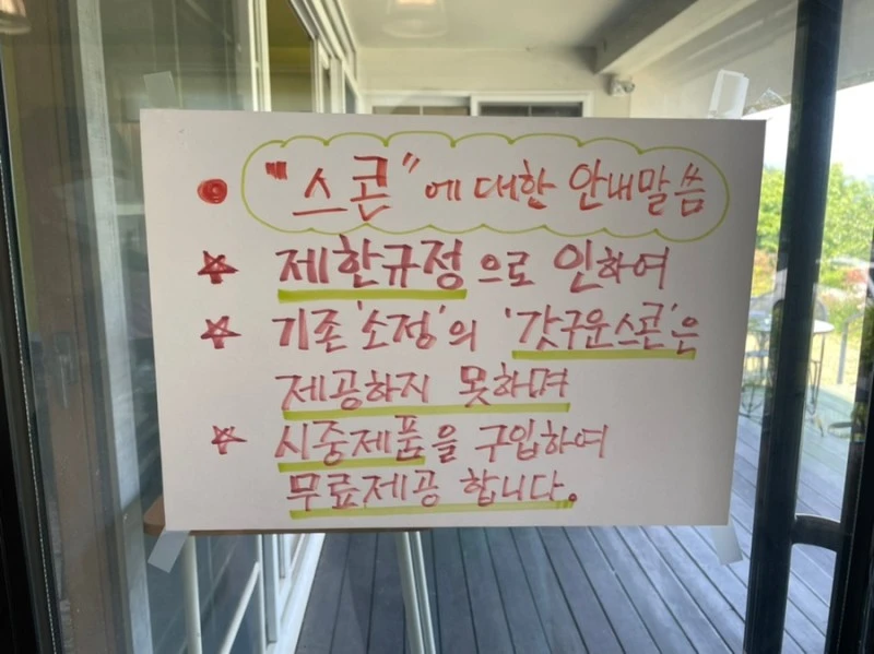 생각만 해봐도, 길 건너의 운동회 소리는 나무 잎사귀 사이로 바람과 섞여들고, 저 멀리는 한가로운 대청호의 풍경, 그리고 찍찍찍, 빙글빙글 돌아가는 스프링클러의 소리라니. 이 어찌 사랑하지 않을 수 있는 공간이란 말일까. 우리는 아이를 데리고 갔기에, 가게 안으로 들어가진 못하고 차양 아래 테라스에 자리를 잡았다. 아주 살짝 덥긴 하다. 그러나, 이보다 호사는 또 없다. 방 안에 갇혀서 창문의 프레임만으로 이 풍광을 보는 것보단, 이렇게 있는 그대로의 봄바람을 즐기는 것이 훨씬 좋을 테지.