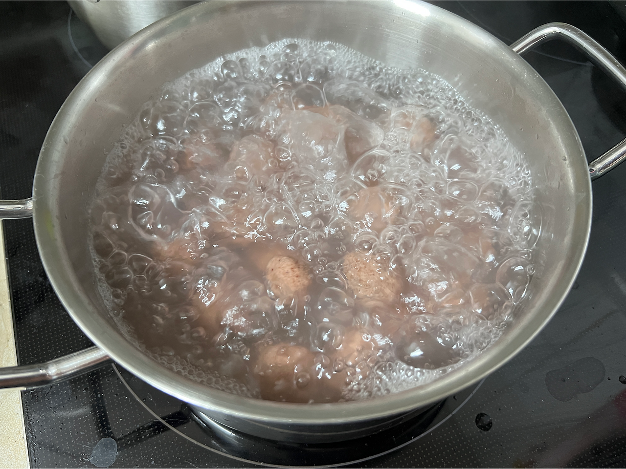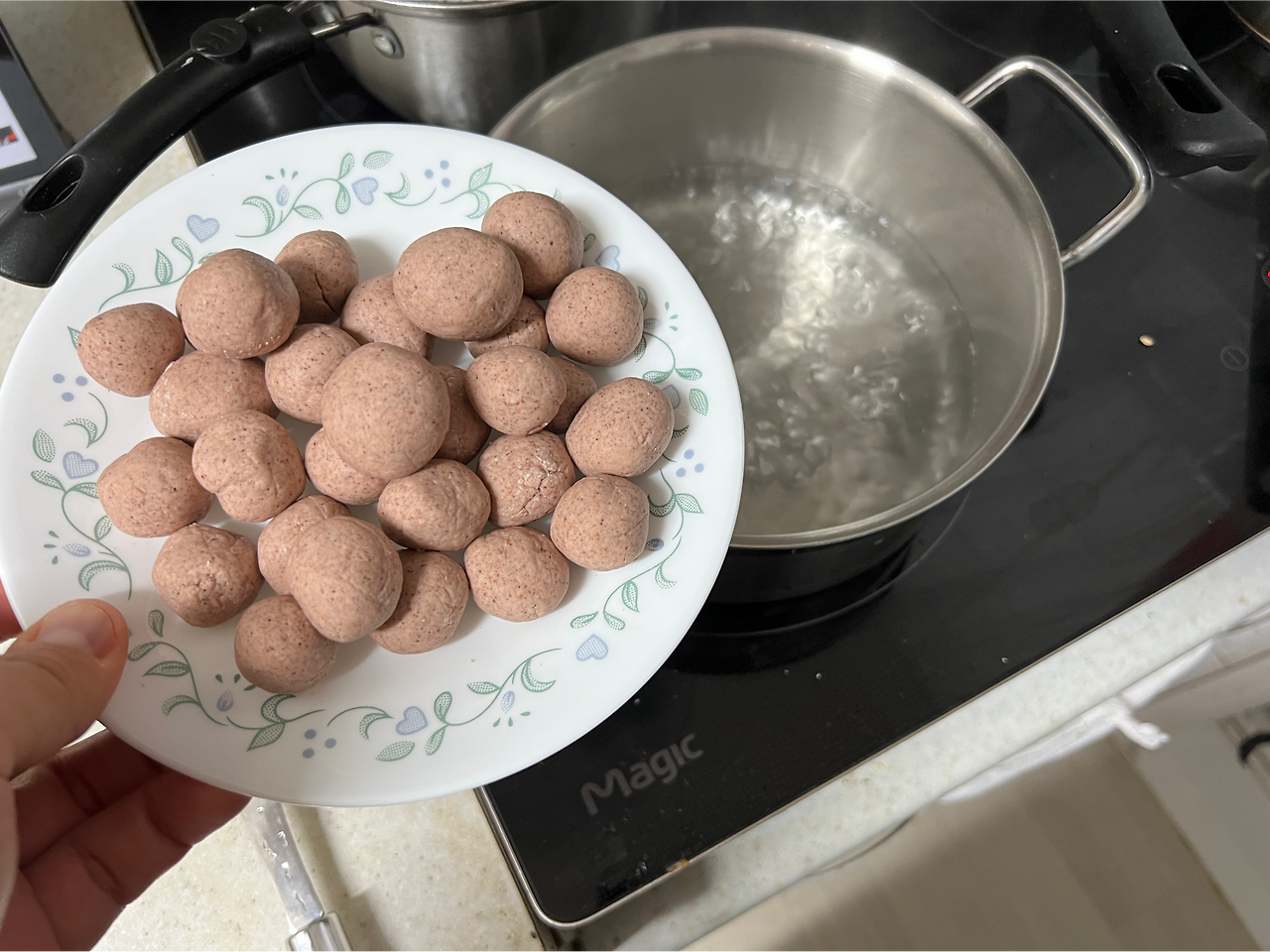 마침 40분 가까이 가루만 내고 나니 팥도 거진 다 쑤어졌다. 볼에 내어서 조금 식고, 수분도 날아가게 두고 나는 그 냄비를 그대로 씻어서 물을 다시 채워 끓인다. 이제 경단을 만들어서 떡을 끓여낼 차례. 검색해서 찾아본 레시피에 따르면 조금 수분감 있게, 찰진 반죽으로 하라는데 하다보니 찰지겐 됐지만 감이 잘 오지 않았다. 찌는 것도 아니고 물에 바로 끓여낼 거라 수분이 많으면 곤란한 점이 생긴다. 하여 나는 50g 정도 되는 찹쌀가루를 더해 수분을 낮추었고, 그러느라 경단을 빚을 때 조금 빡빡해서 고생을 했다. 그러나 경단을 하나하나 뚝뚝 떼어서, 어린들 입 사이즈로 그리고 동백이도 씹을 수 있는 사이즈로, 잘 만들어서 이제 끓인다. 퐁당퐁당 우수수, 끓는 물에 팔팔. 요즘 아이 책을 읽어주느라 입에 의성어가 좀 붙네.