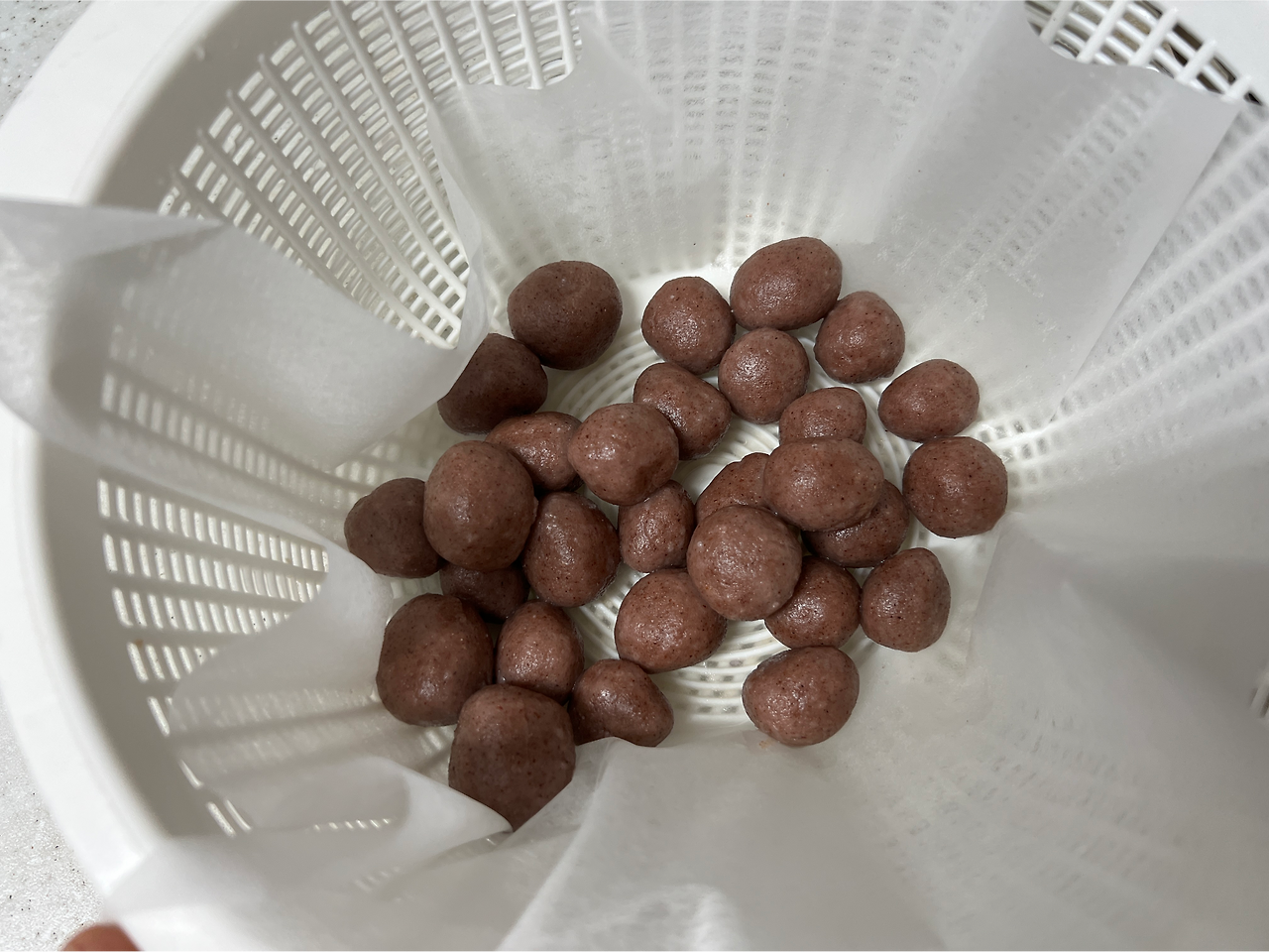 수분을 오래 빼면 안될 거야. 수수경단이 팥소에 잘 묻도록, 살짝만 열을 식힌 뒤에 팥 소에 경단을 넣는다. 그런 다음엔 고민하지 않고 경단에 그대로 팥소를 뭉쳐서 쓱쓱.